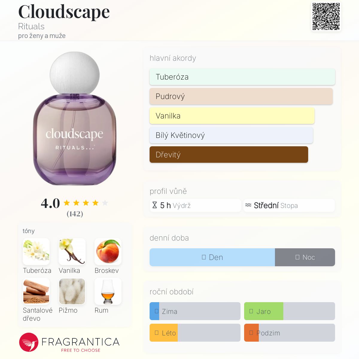 Cloudscape podle Rituals je Orientální Floral vůně pro ženy a muže. Toto je nová vůně. Cloudscape byl/a uveden/a v roce 2025. "Nosem" za touto vůní je Marine Mercé. Vrchní tóny jsou Bílá broskev a Rum; střední tón jeTuberóza ; základní tóny jsou Vanilka, Santalové dřevo a Pižmo.
