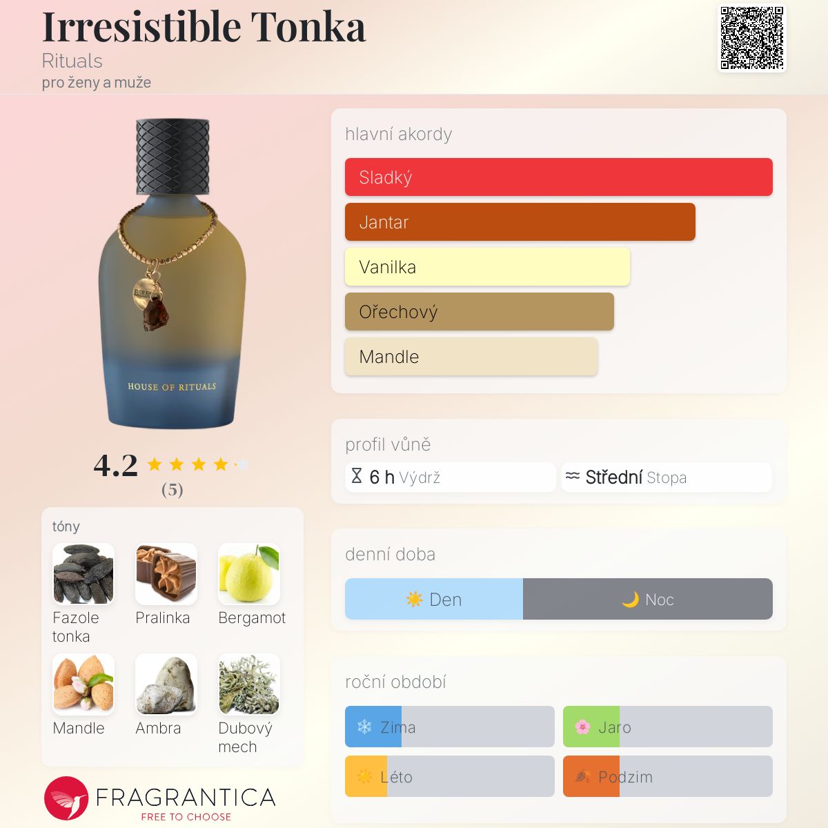 Irresistible Tonka podle Rituals je Orientální vůně pro ženy a muže. Irresistible Tonka byl/a uveden/a v roce 2021. Vrchní tóny jsou Bergamot a Mandle; střední tóny jsouFazole tonka a Ambra ; základní tóny jsou Pralinka a Mech.