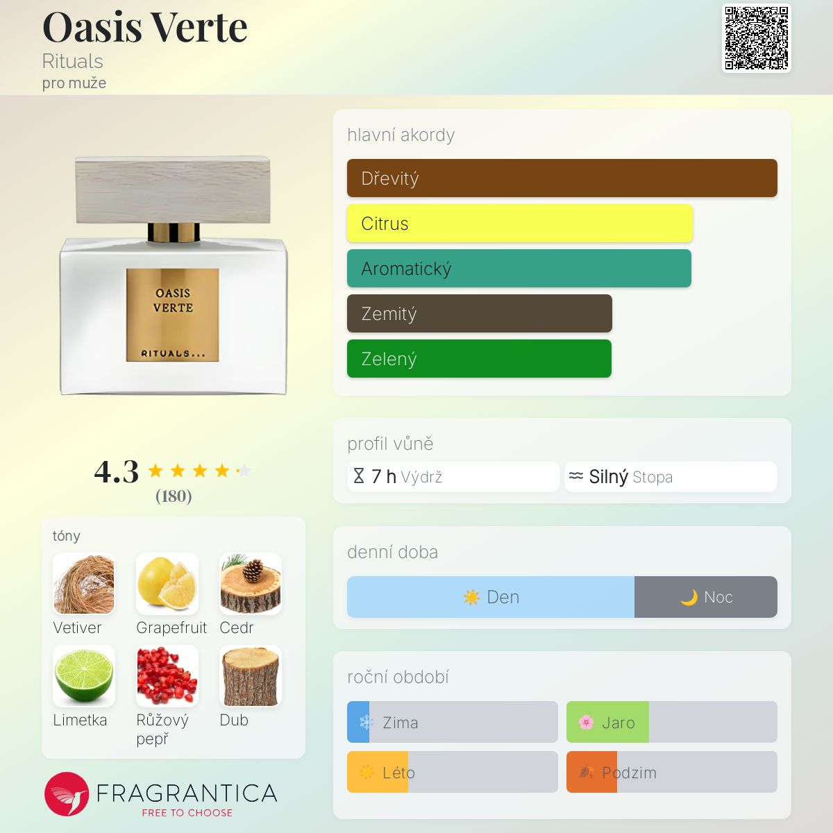 Oasis Verte podle Rituals je Woody Spicy vůně pro muže. Oasis Verte byl/a uveden/a v roce 2017. Vrchní tóny jsou Grapefruit, Limetka a Růžový pepř; střední tóny jsouRebarbora, Ženšen, Bourbonské geránium a Fialka ; základní tóny jsou Vetiver, Atlasový cedr, Dub a Pačuli.