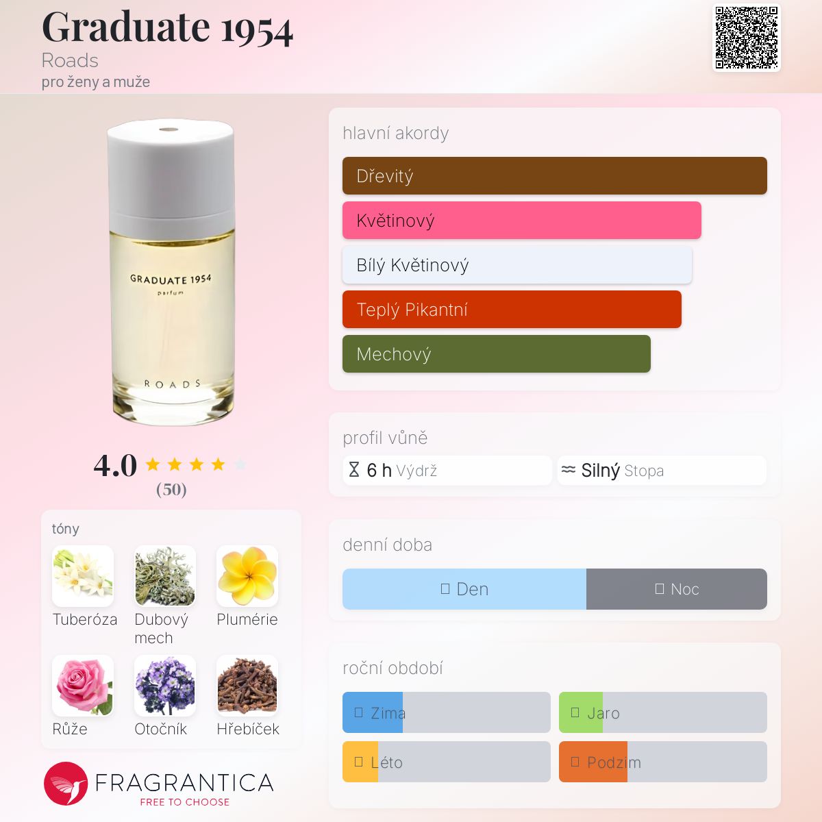 Graduate 1954 podle Roads je Chypre Floral vůně pro ženy a muže. Graduate 1954 byl/a uveden/a v roce 2014. Vrchní tóny jsou Tuberóza, Plumérie, Růže a Otočník; střední tóny jsouHřebíček, Konvalinka a Mandarinka ; základní tóny jsou Mech, Cedr, Pačuli a Santalové dřevo.