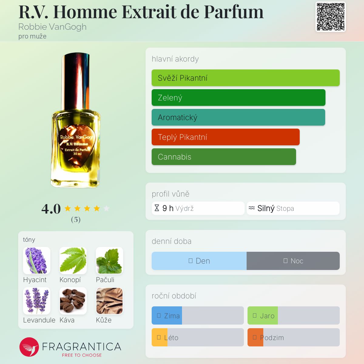 R.V. Homme Extrait de Parfum podle Robbie VanGogh je Aromatic Fougere vůně pro muže. R.V. Homme Extrait de Parfum byl/a uveden/a v roce 2011. "Nosem" za touto vůní je Rob Denton.