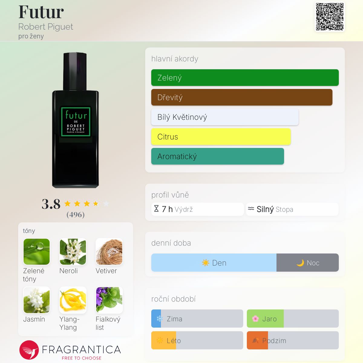 Futur podle Robert Piguet je Floral Green vůně pro ženy. Futur byl/a uveden/a v roce 2009. "Nosem" za touto vůní je Aurélien Guichard. Vrchní tóny jsou Zelené tóny, Neroli a Bergamot; střední tóny jsouJasmín, Ylang-Ylang, Fialkový list a Fialka ; základní tóny jsou Vetiver, Virginský cedr a Pačuli.
