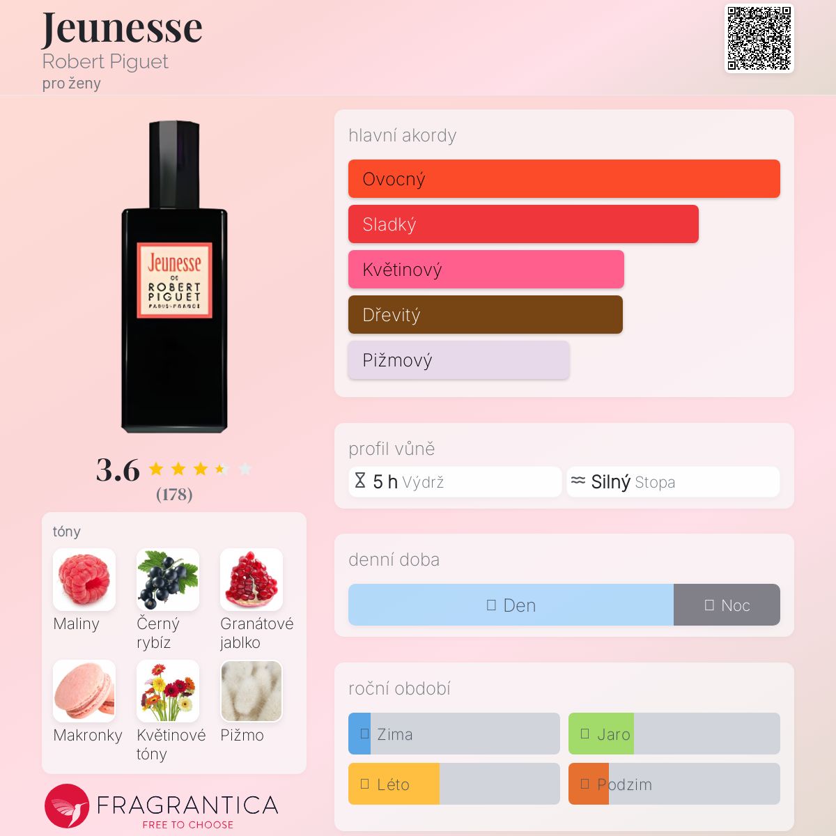 Jeunesse podle Robert Piguet je Floral Fruity vůně pro ženy. Jeunesse byl/a uveden/a v roce 2012. "Nosem" za touto vůní je Aurélien Guichard. Vrchní tóny jsou Maliny, Černý rybíz a Makronky; střední tóny jsouGranátové jablko a Květinové tóny ; základní tón je Pižmo.