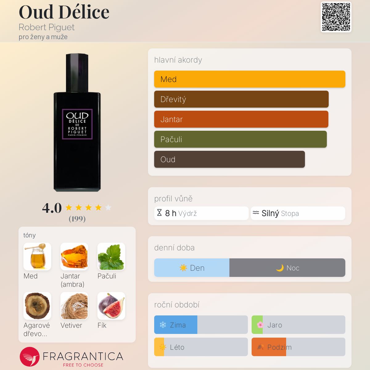 Oud Délice podle Robert Piguet je Orientální Woody vůně pro ženy a muže. Oud Délice byl/a uveden/a v roce 2015. "Nosem" za touto vůní je Aurélien Guichard. Vrchní tóny jsou Med a Fík; střední tón jeAgarové dřevo (oud) ; základní tóny jsou Jantar (ambra), Pačuli a Haitský vetiver.