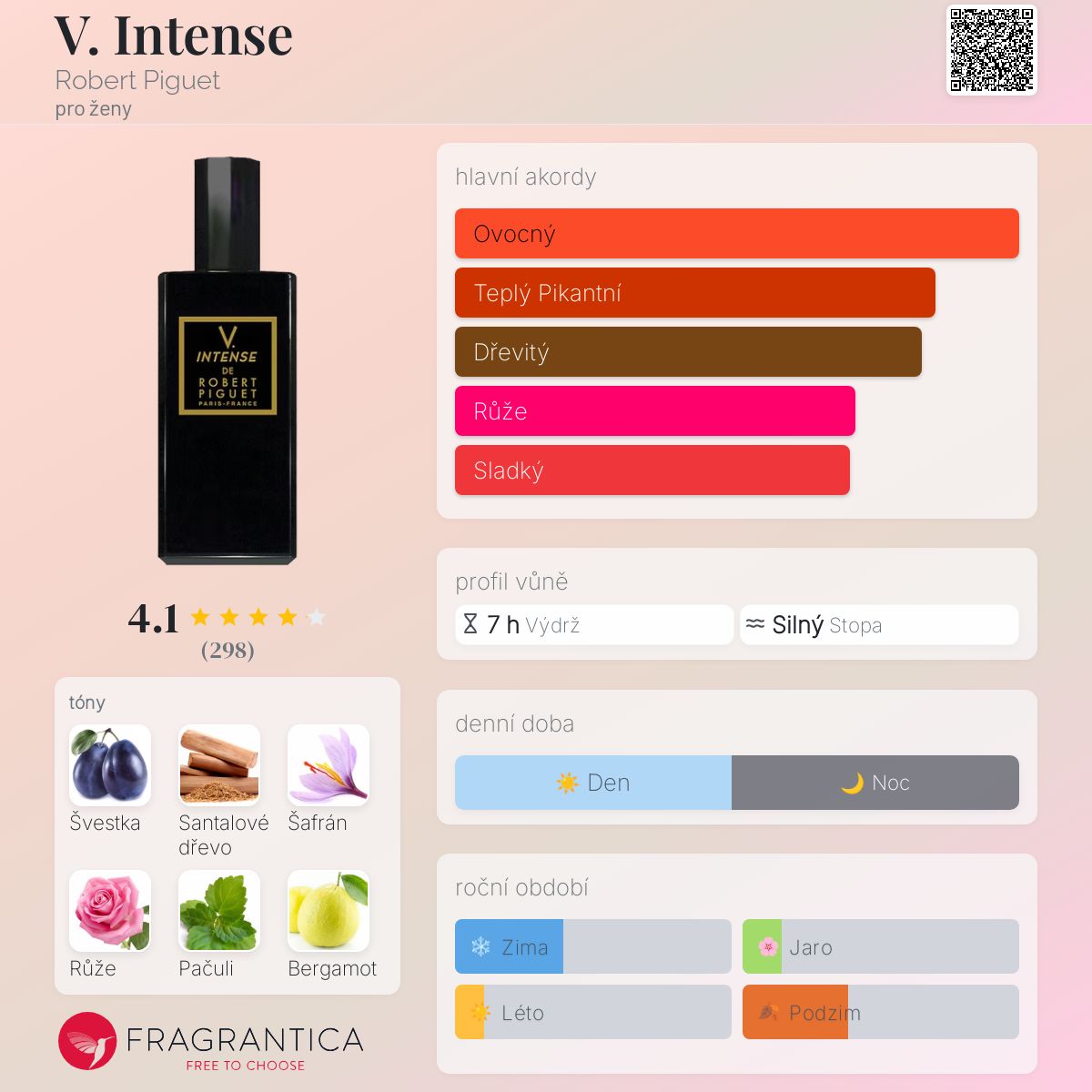 V. Intense podle Robert Piguet je Orientální Floral vůně pro ženy. V. Intense byl/a uveden/a v roce 2014. "Nosem" za touto vůní je Aurélien Guichard.