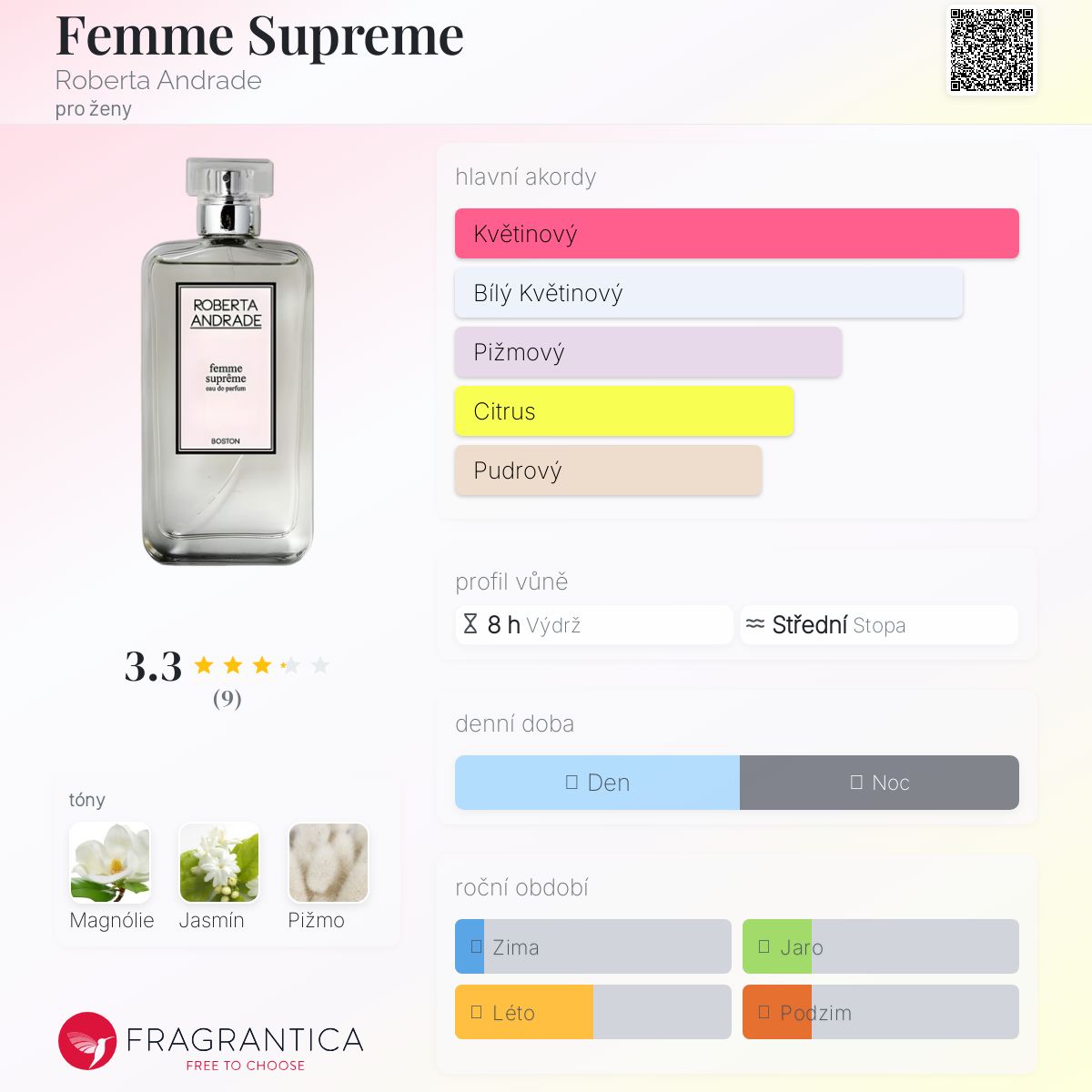 Femme Supreme podle Roberta Andrade je Floral vůně pro ženy. Femme Supreme byl/a uveden/a v roce 2013.