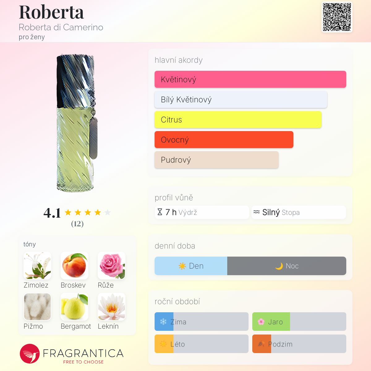 Roberta podle Roberta di Camerino je Orientální Floral vůně pro ženy. Roberta byl/a uveden/a v roce 1998. Vrchní tóny jsou Broskev, Bergamot, Citron amalfi a Mandarinka; střední tóny jsouZimolez, Růže, Leknín, Frézie, Konvalinka, Magnólie, Jasmín a Kořen kosatce ; základní tóny jsou Pižmo, Virginský cedr, Santalové dřevo, Jantar (ambra), Fazole tonka, Vetiver a Vanilka.