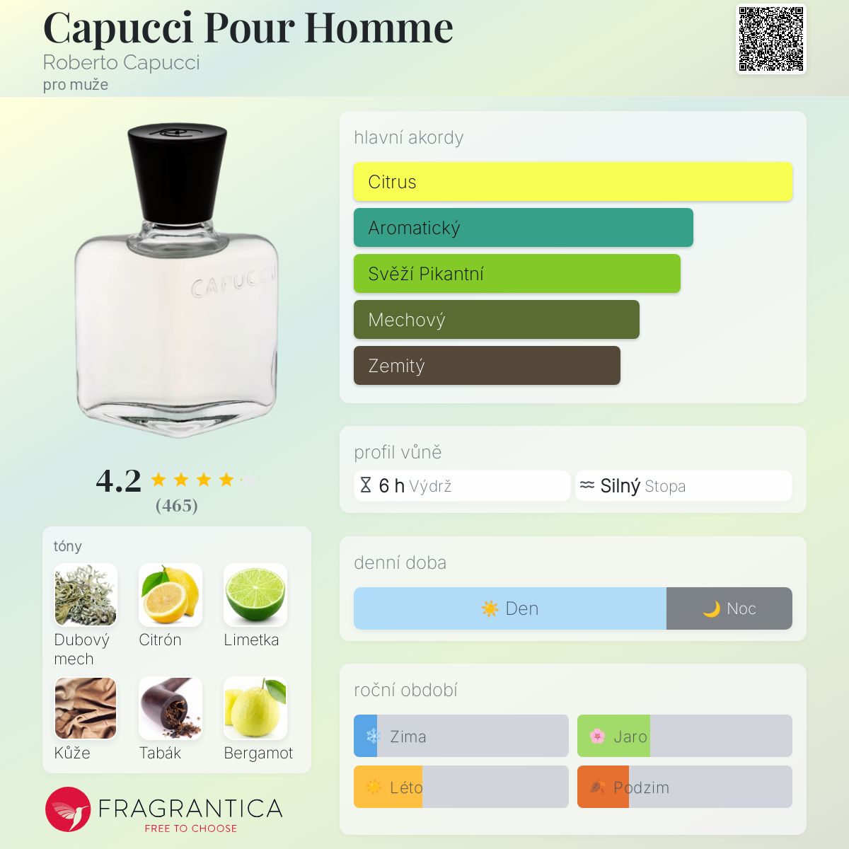 Capucci Pour Homme podle Roberto Capucci je Chypre vůně pro muže. Capucci Pour Homme byl/a uveden/a v roce 1967. Vrchní tóny jsou Citron amalfi , Limetka, Bergamot, Bazalka a Anýz; střední tóny jsouLevandule, Pimentovník, Jasmín, Brambořík a Ovocné tóny ; základní tóny jsou Dubový mech, Kůže, Tabák, Kadidlo, Pačuli, Pižmo a Jantar (ambra).