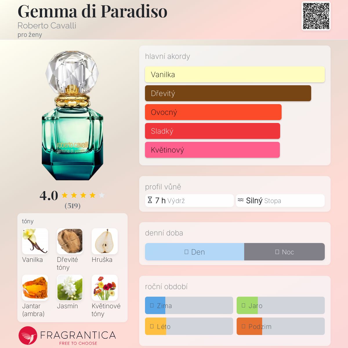 Gemma di Paradiso podle Roberto Cavalli je Orientální Floral vůně pro ženy. Gemma di Paradiso byl/a uveden/a v roce 2018. Vrchní tóny jsou Hruška a Mandarinka; střední tóny jsouJasmín a Květinové tóny ; základní tóny jsou Vanilka, Vzácné dřevo a Jantar (ambra).