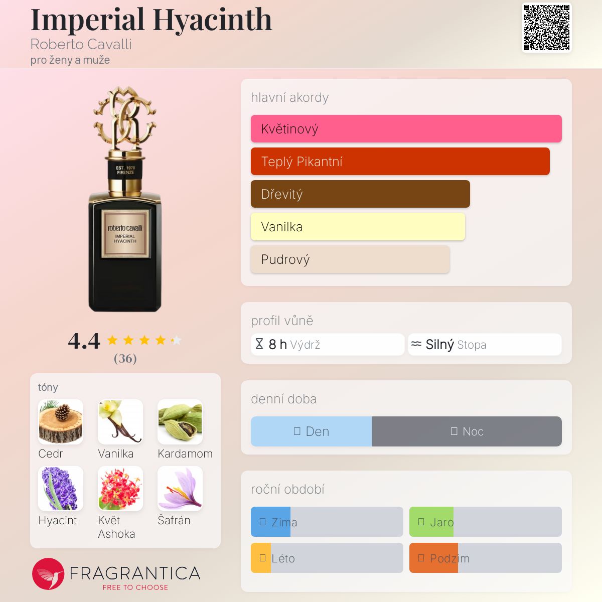 Imperial Hyacinth podle Roberto Cavalli je Orientální Floral vůně pro ženy a muže. Imperial Hyacinth byl/a uveden/a v roce 2018. "Nosem" za touto vůní je Jacques Huclier. Vrchní tóny jsou Kardamom, Šafrán a Bergamot; střední tóny jsouHyacint, Květ Ashoka a Petalia ; základní tóny jsou Cedr, Vanilka, Slaměnka a Pižmo.