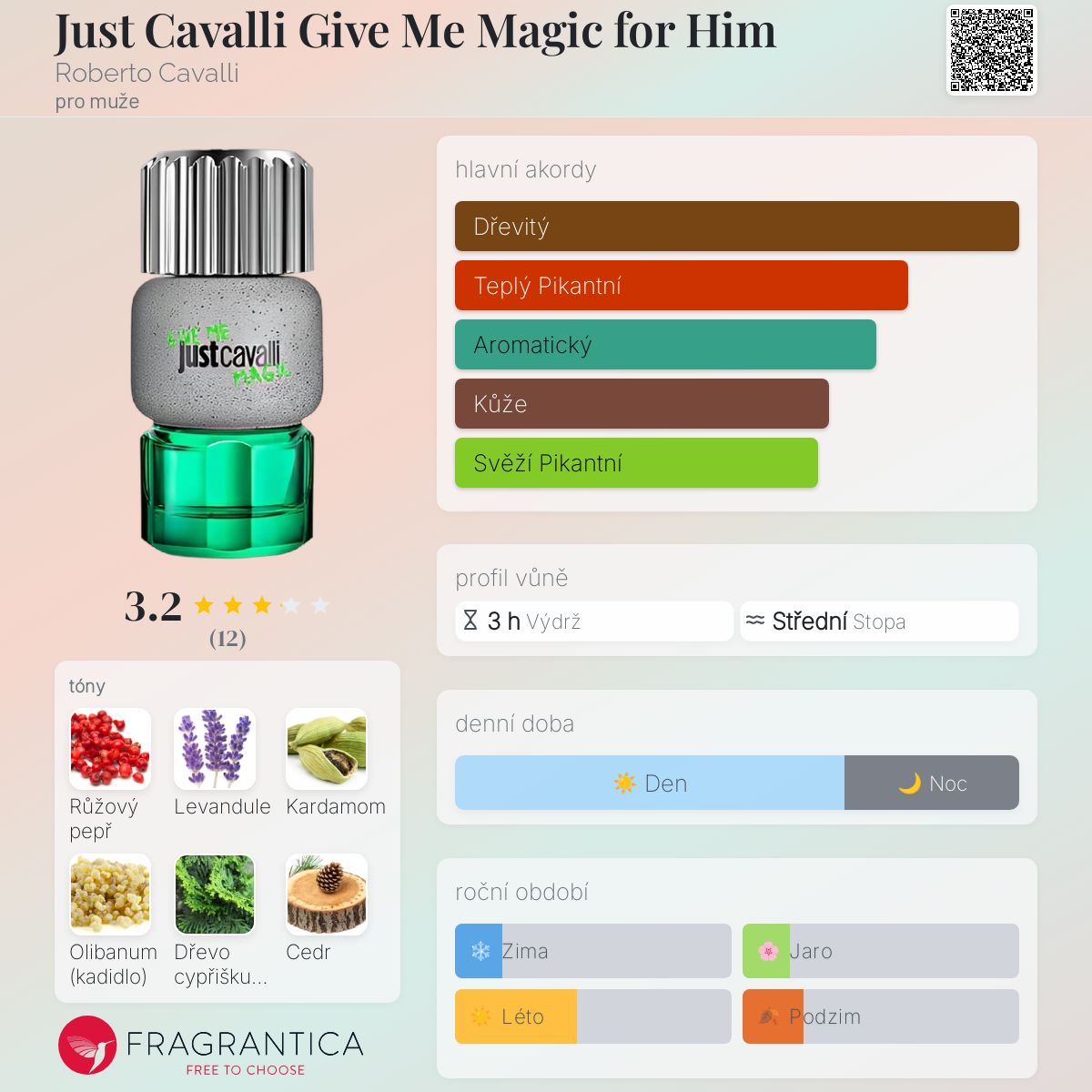 Just Cavalli Give Me Magic for Him podle Roberto Cavalli je Woody Spicy vůně pro muže. Toto je nová vůně. Just Cavalli Give Me Magic for Him byl/a uveden/a v roce 2025. Vrchní tóny jsou Růžový pepř, Levandule a Kardamom; střední tóny jsouDřevo cypřišku tupolistého, Kadidlo, Cedr a Šafrán ; základní tóny jsou Guajakové dřevo, Vanilka, Kůže, Tabák a Ambrofix™.