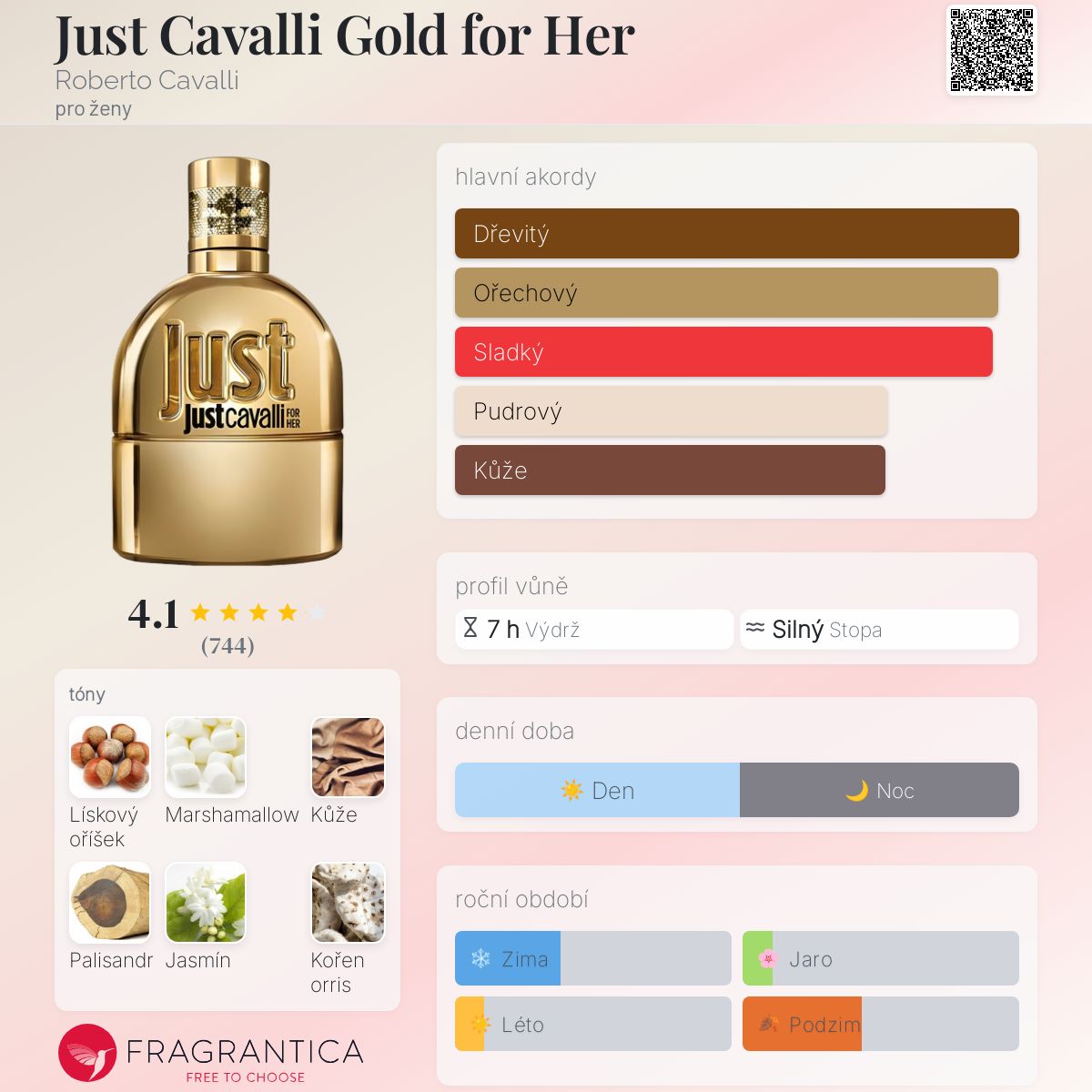 Just Cavalli Gold for Her podle Roberto Cavalli je Orientální Floral vůně pro ženy. Just Cavalli Gold for Her byl/a uveden/a v roce 2014. "Nosem" za touto vůní je Fabrice Pellegrin. Vrchní tóny jsou Lískový oříšek a Mandarinka; střední tóny jsouMarshamallow, Jasmín a Kořen orris ; základní tóny jsou Kůže a Palisandr.