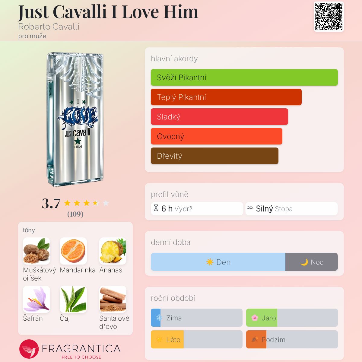 Just Cavalli I Love Him podle Roberto Cavalli je Orientální Spicy vůně pro muže. Just Cavalli I Love Him byl/a uveden/a v roce 2010. Just Cavalli I Love Him byl/a vytvořen/a Karine Dubreuil-Sereni a Mathilde Bijaoui. Vrchní tóny jsou Mandarinka, Ananasový list a Zázvor; střední tóny jsouMuškátový oříšek, Šafrán, Zelený čaj a Černý pepř ; základní tóny jsou Santalové dřevo, Fazole tonka, Pačuli a Francouzské labdanum.