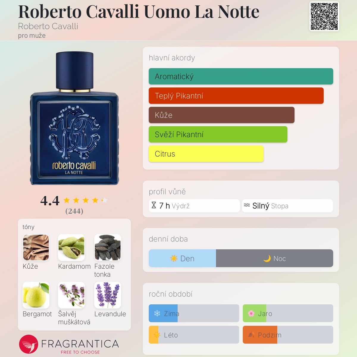 Roberto Cavalli Uomo La Notte podle Roberto Cavalli je Orientální Fougere vůně pro muže. Roberto Cavalli Uomo La Notte byl/a uveden/a v roce 2018. "Nosem" za touto vůní je Christophe Raynaud. Vrchní tóny jsou Bergamot a Levandule; střední tóny jsouKardamom, Šalvěj muškátová a Černý pepř ; základní tóny jsou Kůže, Fazole tonka a Pačuli.