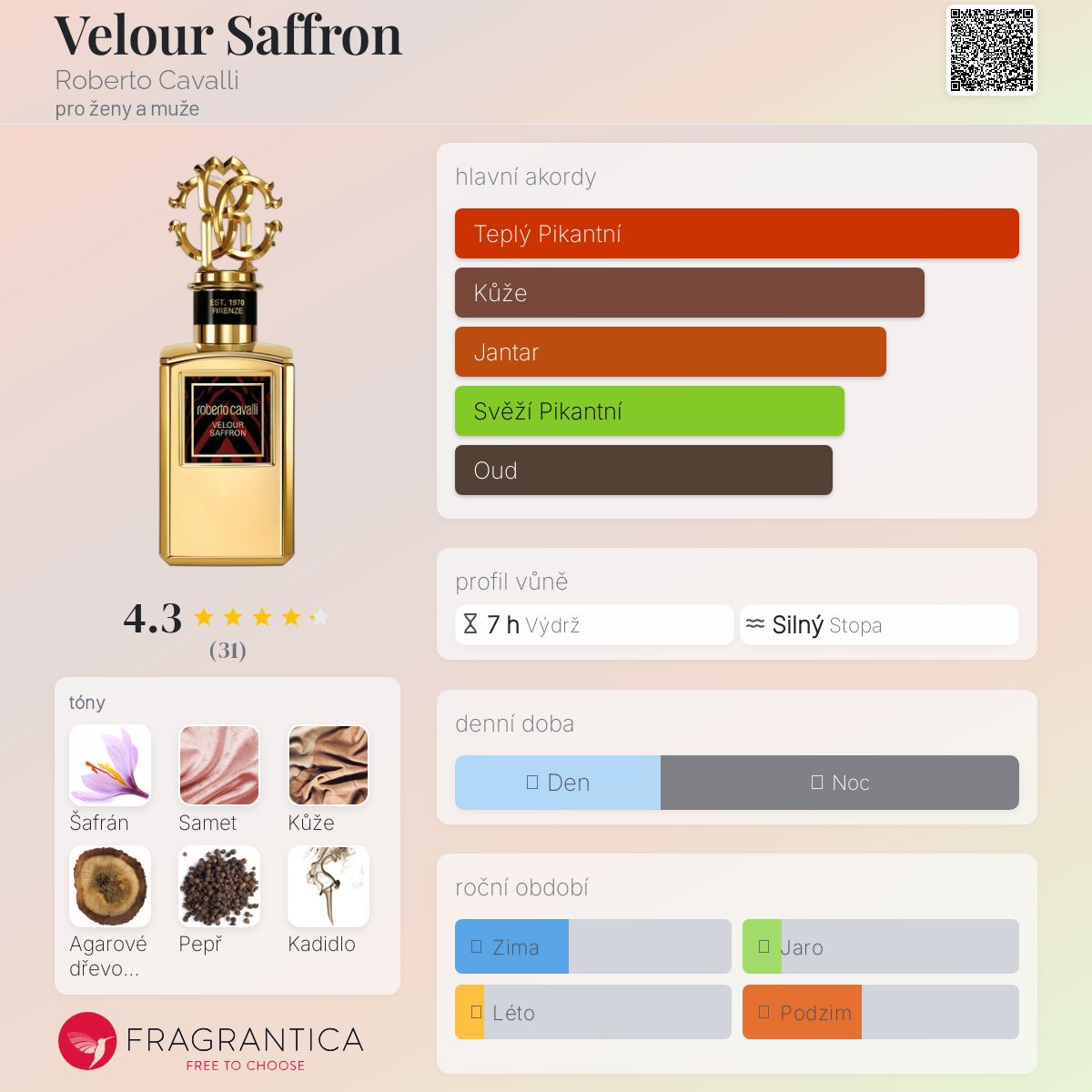 Velour Saffron podle Roberto Cavalli je Leather vůně pro ženy a muže. Velour Saffron byl/a uveden/a v roce 2021. "Nosem" za touto vůní je Benoist Lapouza. Vrchní tóny jsou Šafrán a Černý pepř; střední tóny jsouSamet, Kůže, Agarové dřevo (oud) a Kadidlo ; základní tóny jsou Myrha a Dřevité tóny.