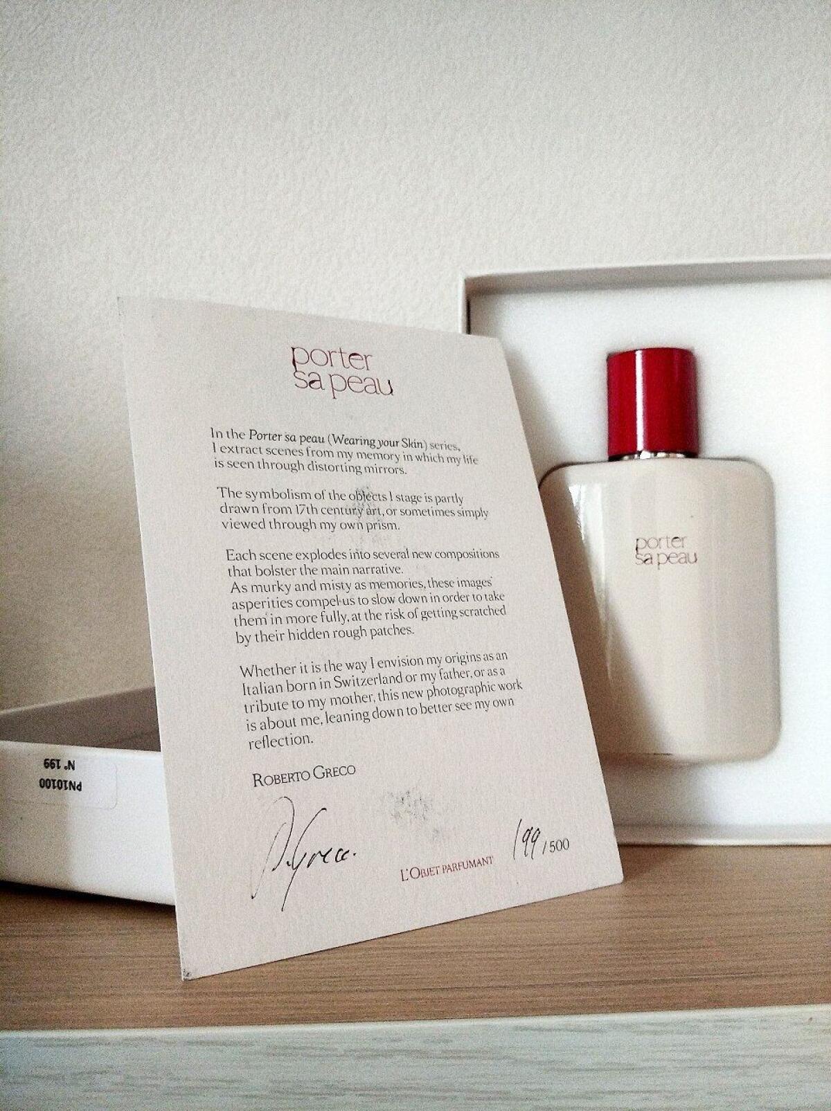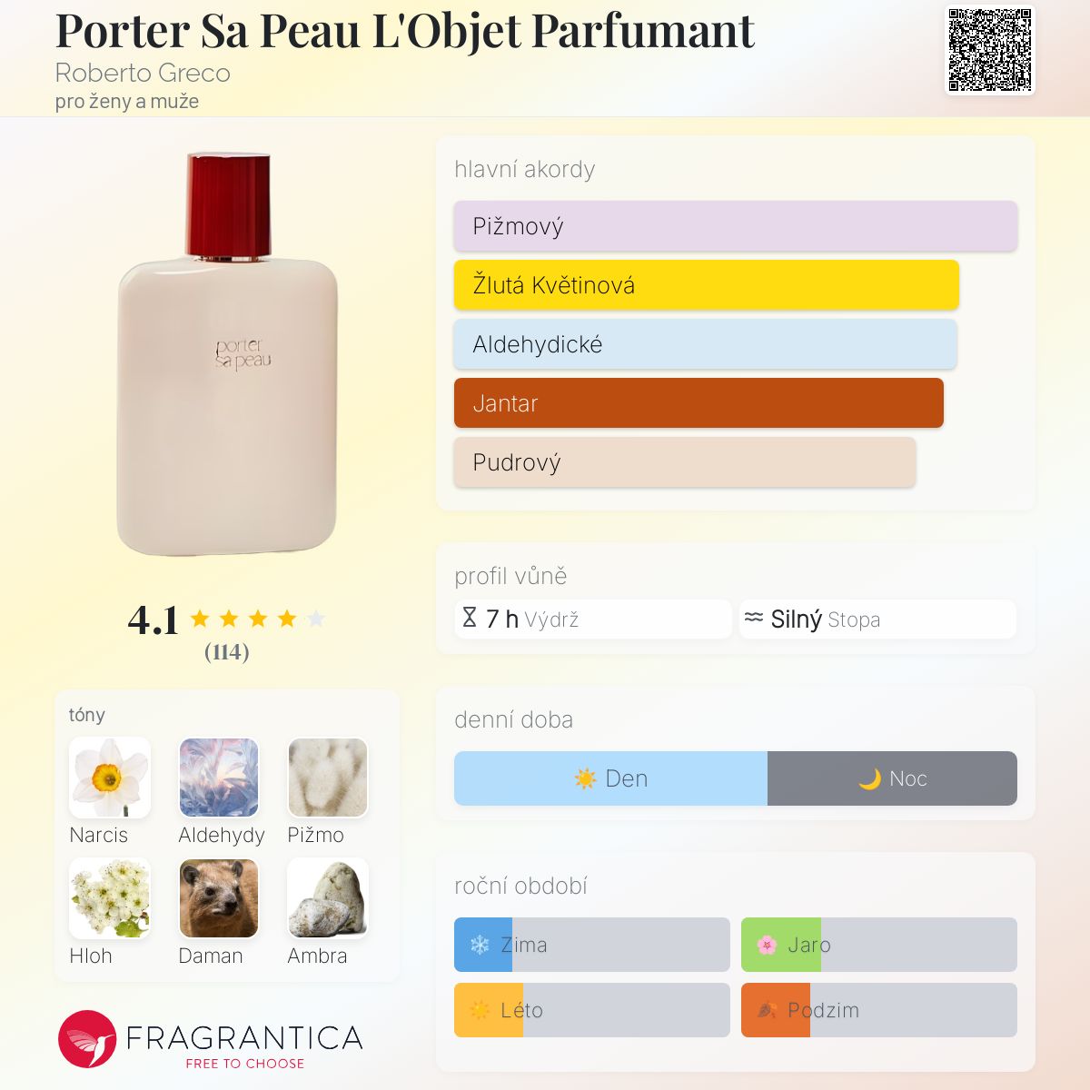 Porter Sa Peau L'Objet Parfumant podle Roberto Greco je Floral Aldehyde vůně pro ženy a muže. Porter Sa Peau L'Objet Parfumant byl/a uveden/a v roce 2020. "Nosem" za touto vůní je Rodrigo Flores-Roux. Vrchní tóny jsou Aldehydy, Hloh, Andělika a Šalvěj muškátová; střední tóny jsouNarcis, Ylang-Ylang, Orris, Otruby, Jasmín a Bulharská růže ; základní tóny jsou Pižmo, Daman, Ambra, Kůže, Dubový mech, Balzám Tolu, Pačuli, Bílé santalové dřevo, Vetiver a Dřevo akigala.