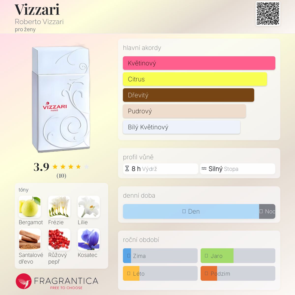 Vizzari podle Roberto Vizzari je Floral Woody Musk vůně pro ženy. Vizzari byl/a uveden/a v roce 2013. Vrchní tóny jsou Bergamot, Frézie, Růžový pepř a Zelené listí; střední tóny jsouLilie, Kosatec, Broskev a Travní růže ; základní tóny jsou Santalové dřevo, Pižmo a Vanilka.