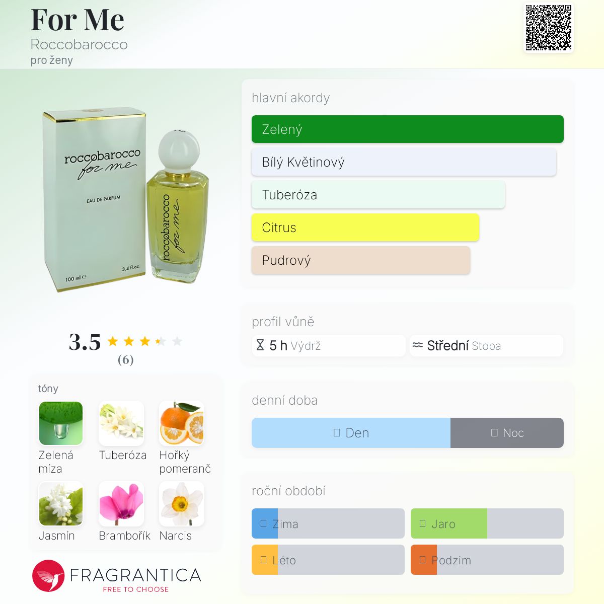 For Me podle Roccobarocco je vůně pro ženy. Vrchní tóny jsou Zelená míza a Hořký pomeranč; střední tóny jsouTuberóza, Jasmín, Brambořík, Narcis a Kosatec ; základní tóny jsou Santalové dřevo, Pižmo a Bílý jantar (ambra).