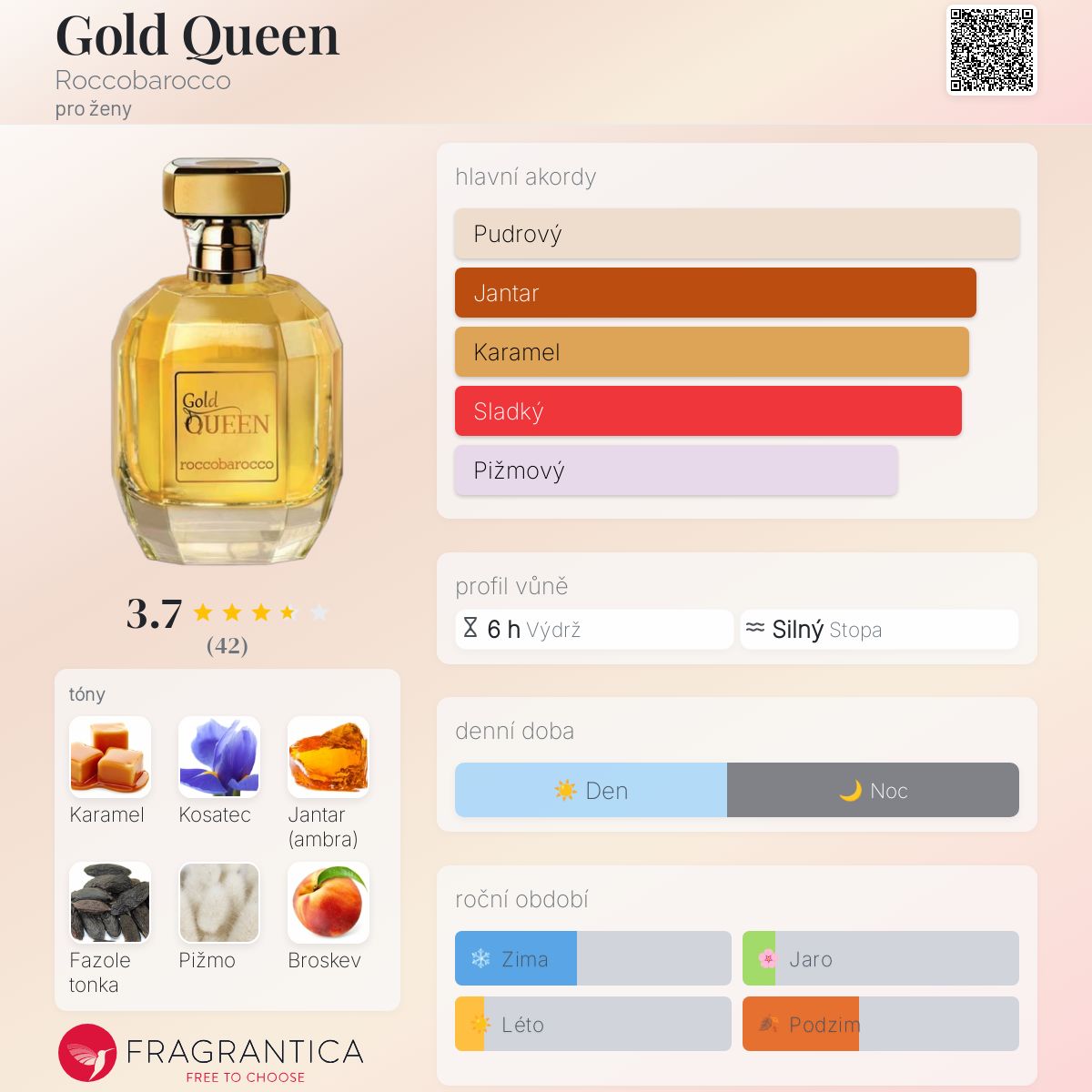 Gold Queen podle Roccobarocco je Floral Fruity Gourmand vůně pro ženy. Gold Queen byl/a uveden/a v roce 2018. "Nosem" za touto vůní je Maurizio Cerizza. Vrchní tóny jsou Bílá broskev, Růžový pepř, Pelyněk, Fík a Žlutá mandarinka; střední tóny jsouKaramel, Kosatec, Káva a Růže ; základní tóny jsou Bílý jantar (ambra), Fazole tonka, Pižmo, Santalové dřevo a Kašmírové dřevo.