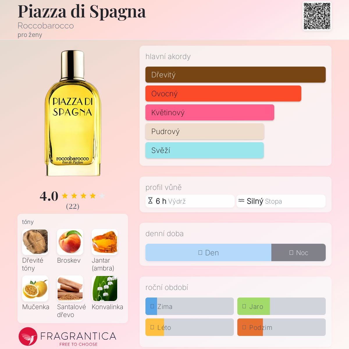 Piazza di Spagna podle Roccobarocco je Floral Fruity vůně pro ženy. Piazza di Spagna byl/a uveden/a v roce 1988. Vrchní tóny jsou Broskev, Mučenka, Černý rybíz a Fialka; střední tóny jsouKonvalinka, Brambořík, Magnólie a Jasmín ; základní tóny jsou Dřevité tóny, Jantar (ambra), Santalové dřevo a Pižmo.