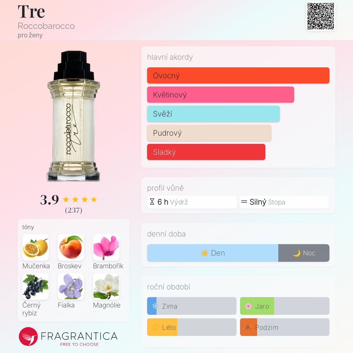 Tre podle Roccobarocco je Floral Fruity vůně pro ženy. Tre byl/a uveden/a v roce 1991. "Nosem" za touto vůní je Maurizio Cerizza. Vrchní tóny jsou Mučenka, Broskev, Černý rybíz a Fialka; střední tóny jsouBrambořík, Magnólie, Konvalinka a Jasmín ; základní tóny jsou Pižmo, Santalové dřevo a Jantar (ambra).