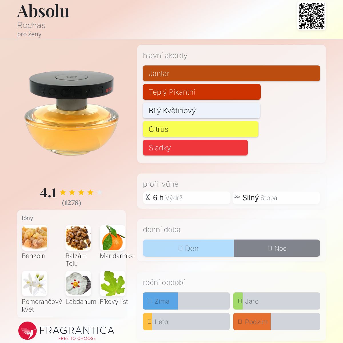 Absolu podle Rochas je Orientální Woody vůně pro ženy. Absolu byl/a uveden/a v roce 2002. "Nosem" za touto vůní je Jacques Cavallier Belletrud. Vrchní tóny jsou Mandarinka a Fíkový list; střední tóny jsouPomerančový květ, Lilie, Pepř a Růže ; základní tóny jsou Benzoin, Balzám Tolu, Labdanum a Cedr.