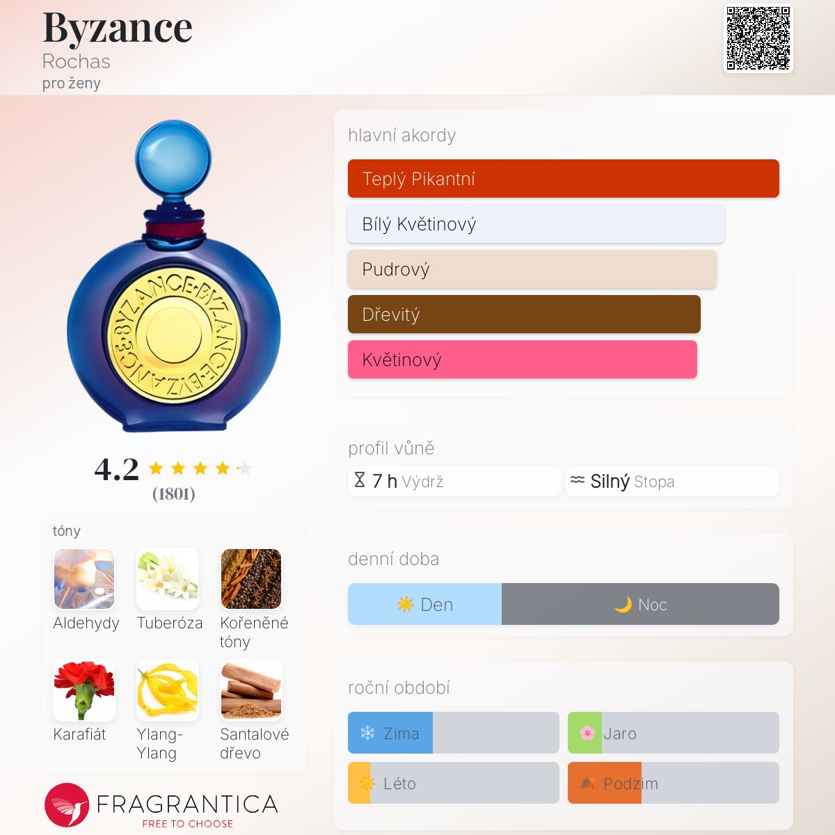 Byzance podle Rochas je Orientální Spicy vůně pro ženy. Byzance byl/a uveden/a v roce 1987. Byzance byl/a vytvořen/a Nicolas Mamounas a Alberto Morillas. Vrchní tóny jsou Aldehydy, Koření, Karafiát, Kardamom, Bazalka, Mandarinka, Citrón a Zelené tóny; střední tóny jsouTuberóza, Ylang-Ylang, Turecká růže, Jasmín, Kořen orris, Anýz a Konvalinka ; základní tóny jsou Santalové dřevo, Otočník, Jantar (ambra), Vanilka, Pižmo a Cedr.