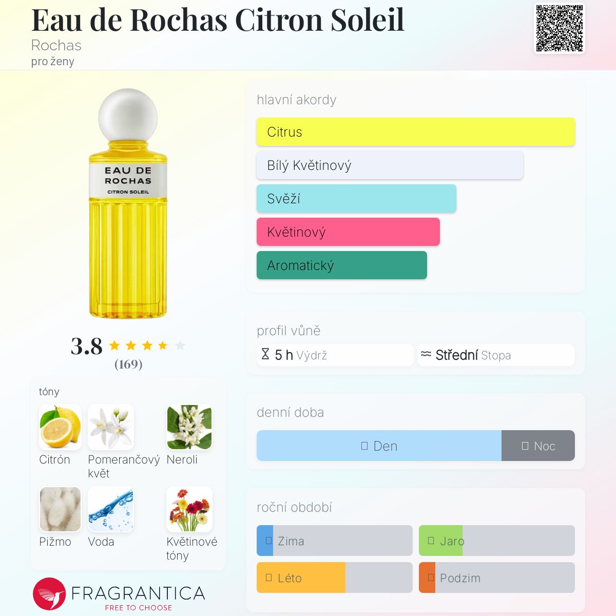 Eau de Rochas Citron Soleil podle Rochas je Citrus Aromatic vůně pro ženy. Eau de Rochas Citron Soleil byl/a uveden/a v roce 2023. Vrchní tóny jsou Citrón, Neroli a Fíkový list; střední tóny jsouPomerančový květ, Vodnaté tóny, Květinové tóny a Růže ; základní tóny jsou Bílé pižmo, Dřevité tóny a Jantar (ambra).