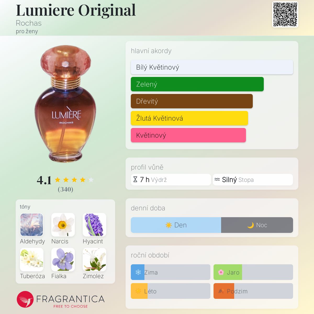 Lumiere Original podle Rochas je Orientální vůně pro ženy. Lumiere Original byl/a uveden/a v roce 1984. "Nosem" za touto vůní je Nicolas Mamounas. Vrchní tóny jsou Aldehydy, Fialka, Pomerančový květ, Zelené listí, Ovocné tóny a Bergamot; střední tóny jsouNarcis, Hyacint, Tuberóza, Zimolez, Ylang-Ylang, Jasmín, Růže, Konvalinka a Kořen kosatce ; základní tóny jsou Dubový mech, Santalové dřevo, Pižmo, Vetiver a Cedr.