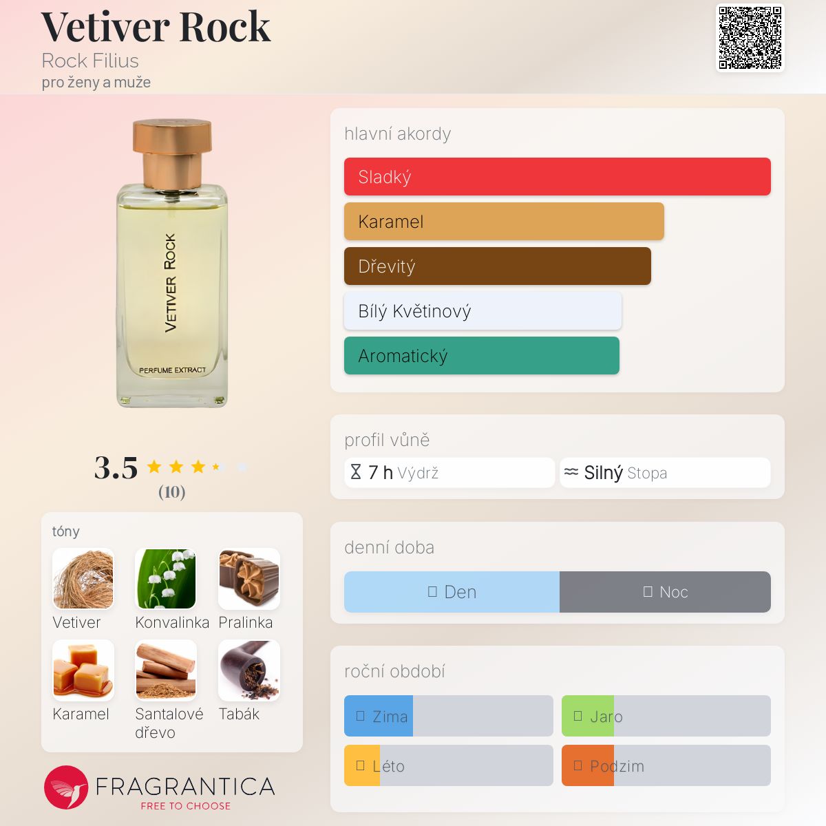 Vetiver Rock podle Rock Filius je Woody Spicy vůně pro ženy a muže. Vetiver Rock byl/a uveden/a v roce 2019. "Nosem" za touto vůní je Tomislav Vrbanec. Vrchní tóny jsou Vetiver a Fazole tonka; střední tóny jsouKonvalinka, Tabák a Lískový oříšek ; základní tóny jsou Pralinka, Karamel a Santalové dřevo.