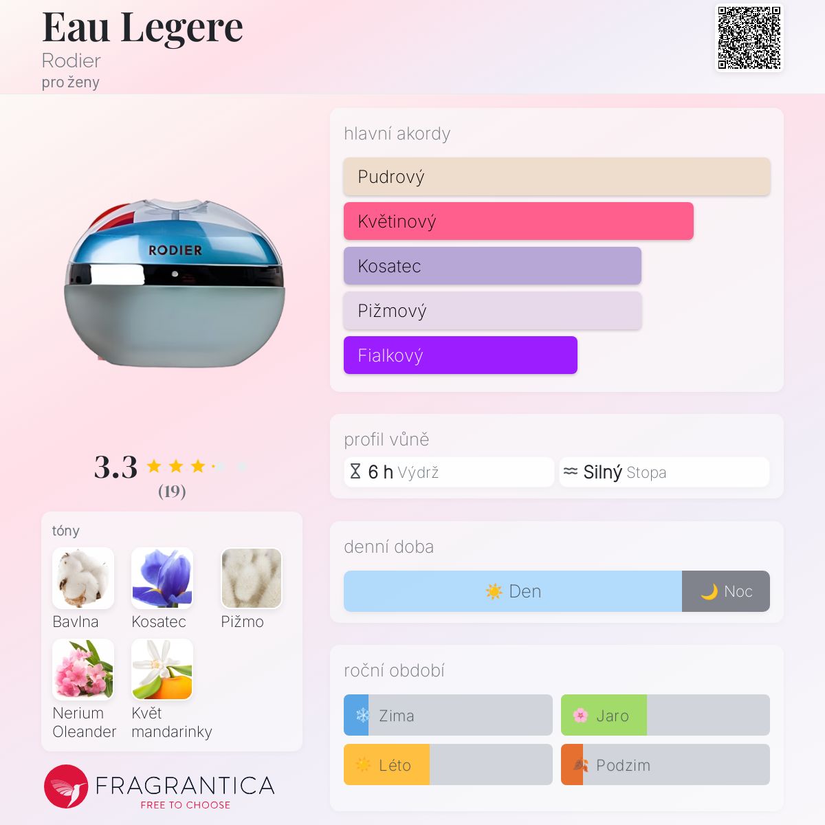 Eau Legere podle Rodier je Floral vůně pro ženy. Eau Legere byl/a uveden/a v roce 2008. Vrchní tóny jsou Bavlna, Růžový oleandr a Mandarinkový květ; střední tón jeKosatec ; základní tón je Pižmo.