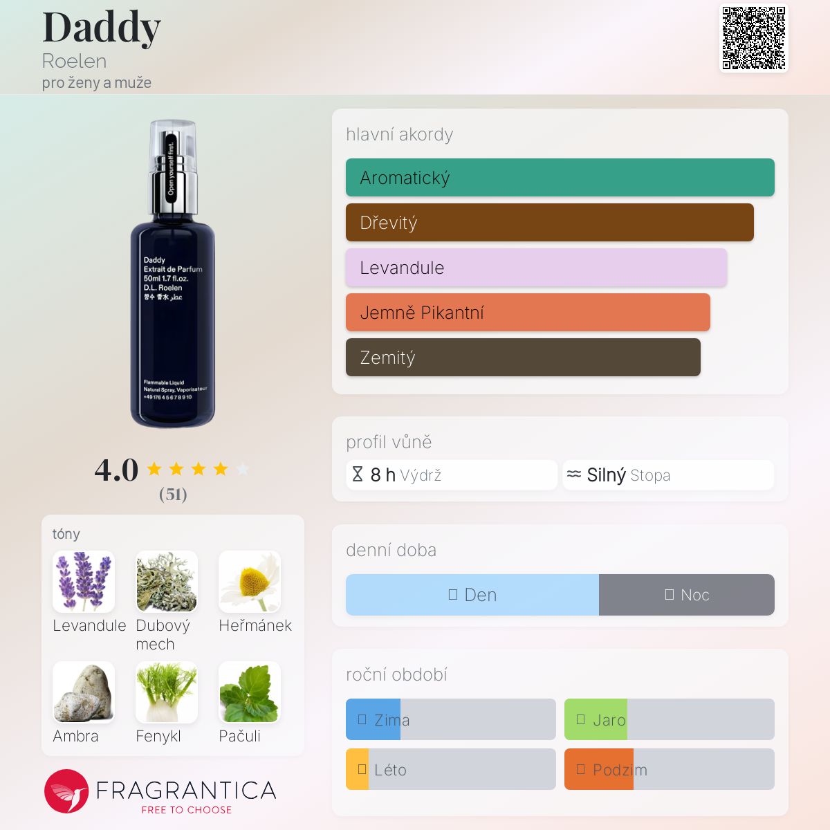 Daddy podle Roelen je Woody Chypre vůně pro ženy a muže. Daddy byl/a uveden/a v roce 2020. "Nosem" za touto vůní je Jorge Lee. Vrchní tóny jsou Heřmánek, Fenykl, Šalvěj muškátová a Mandarinka; střední tóny jsouLevandule, Dubový mech, Virginský cedr a Jasmín ; základní tóny jsou Ambra, Pačuli, Tabák a Vanilka.