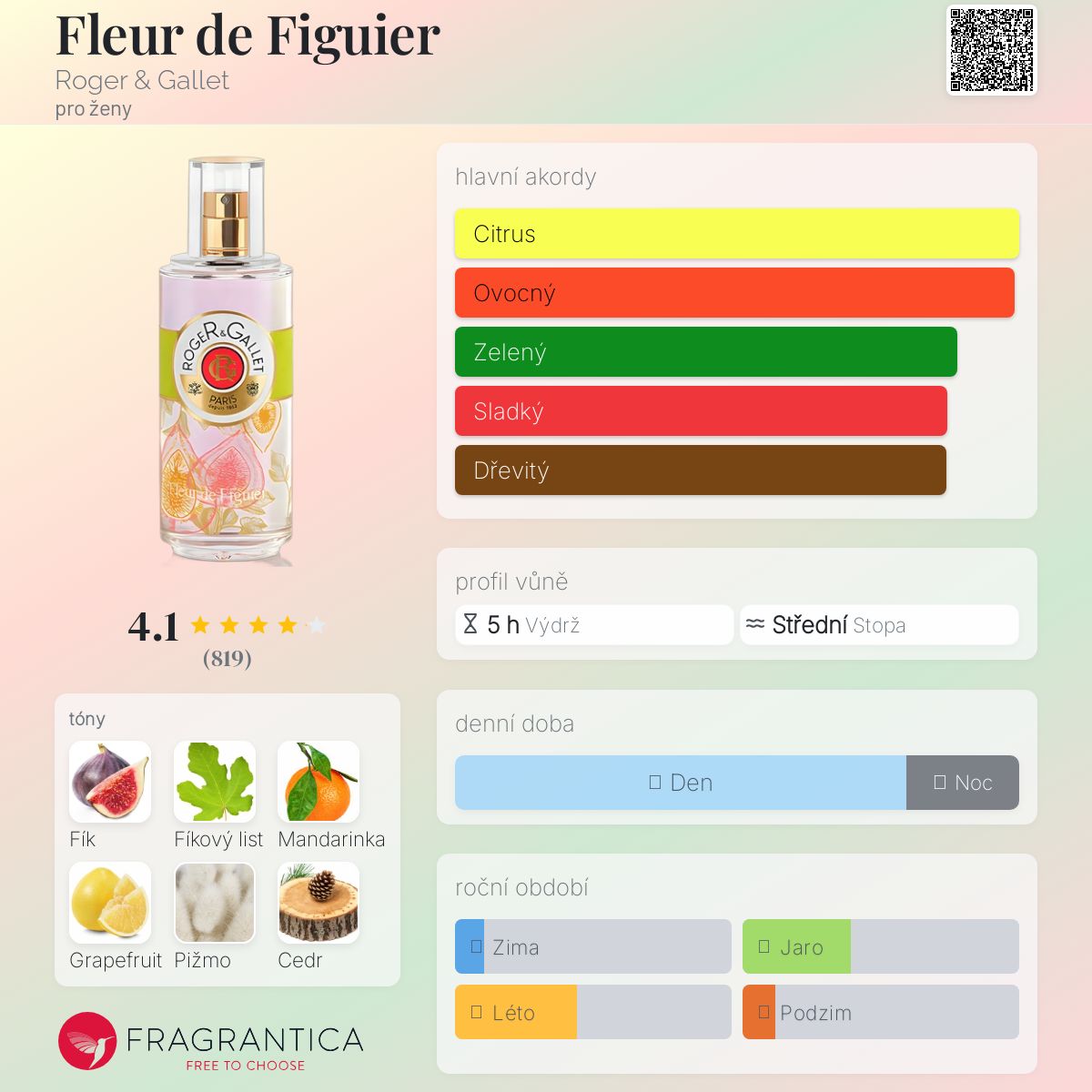Fleur de Figuier podle Roger & Gallet je Aromatic Fruity vůně pro ženy. Fleur de Figuier byl/a uveden/a v roce 2013. "Nosem" za touto vůní je Francis Kurkdjian. Vrchní tóny jsou Mandarinka, Grapefruit a Kmín; střední tóny jsouFík a Fíkový list ; základní tóny jsou Fíkový nektar, Pižmo a Cedr.