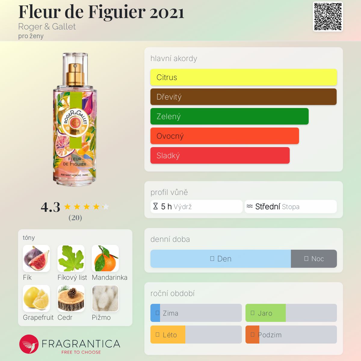 Fleur de Figuier 2021 podle Roger & Gallet je Aromatic Fruity vůně pro ženy. Fleur de Figuier 2021 byl/a uveden/a v roce 2021. "Nosem" za touto vůní je Francis Kurkdjian. Vrchní tóny jsou Mandarinka, Grapefruit a Kmín; střední tóny jsouFík a Fíkový list ; základní tóny jsou Fíkový nektar, Cedr, Pižmo a Pačuli.