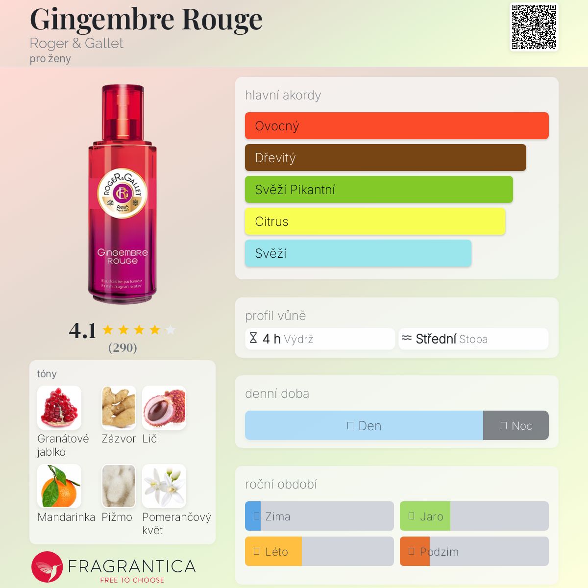 Gingembre Rouge podle Roger & Gallet je Floral Fruity vůně pro ženy. Gingembre Rouge byl/a uveden/a v roce 2014. Gingembre Rouge byl/a vytvořen/a Amandine Clerc-Marie a Alberto Morillas. Vrchní tóny jsou Granátové jablko, Zázvor a Mandarinka; střední tóny jsouKvět zázvoru, Liči a Pomerančový květ ; základní tóny jsou Bílé pižmo, Cedr a Kandovaný zázvor.
