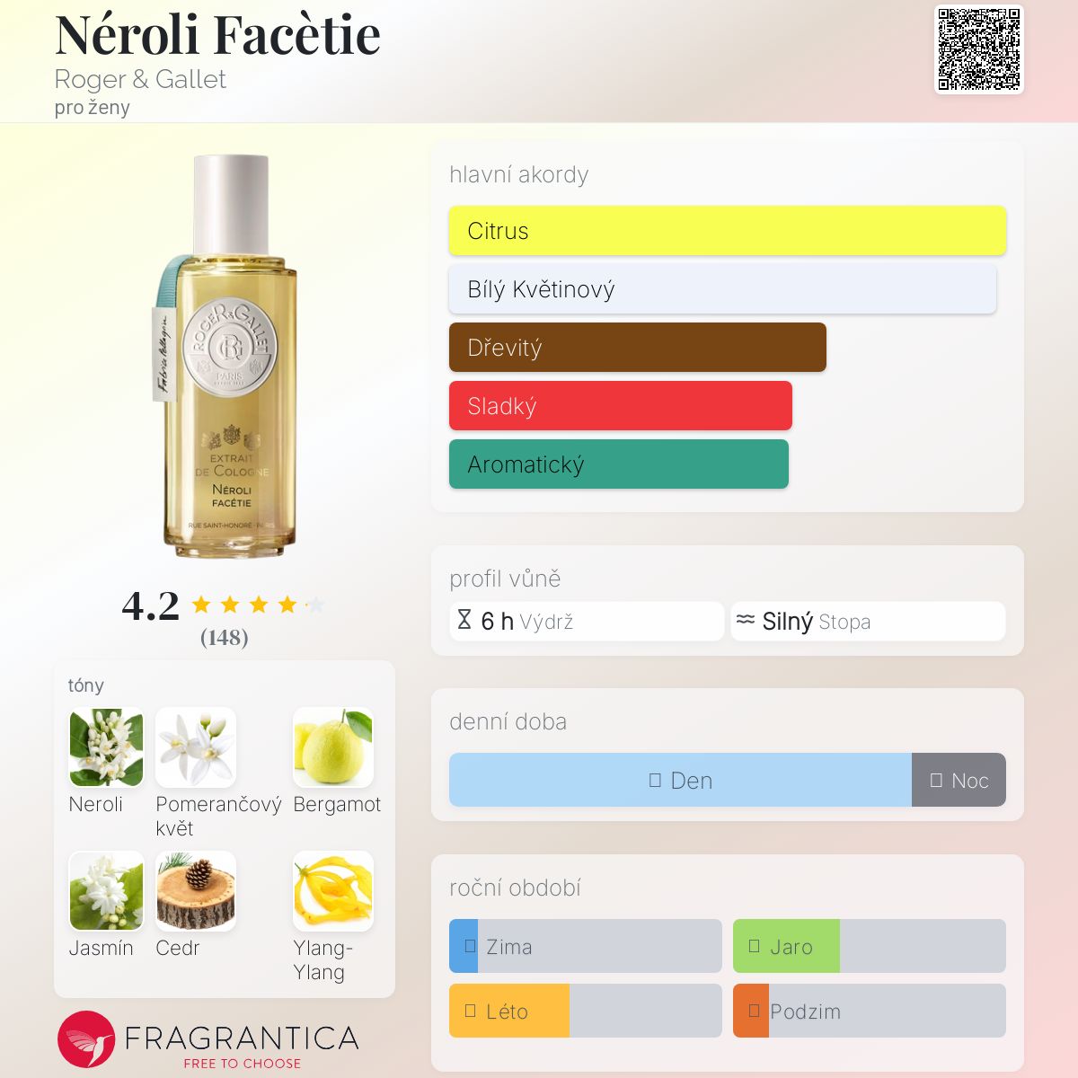 Néroli Facètie podle Roger & Gallet je Citrus Aromatic vůně pro ženy. Néroli Facètie byl/a uveden/a v roce 2017. "Nosem" za touto vůní je Fabrice Pellegrin. Vrchní tóny jsou Esence neroli, Pomerančový květ a Bergamot; střední tóny jsouJasmín Sambac, Ylang-Ylang, Mandarinka, Petitgrain a Slaměnka ; základní tóny jsou Cedr, Andělika a Vetiver.