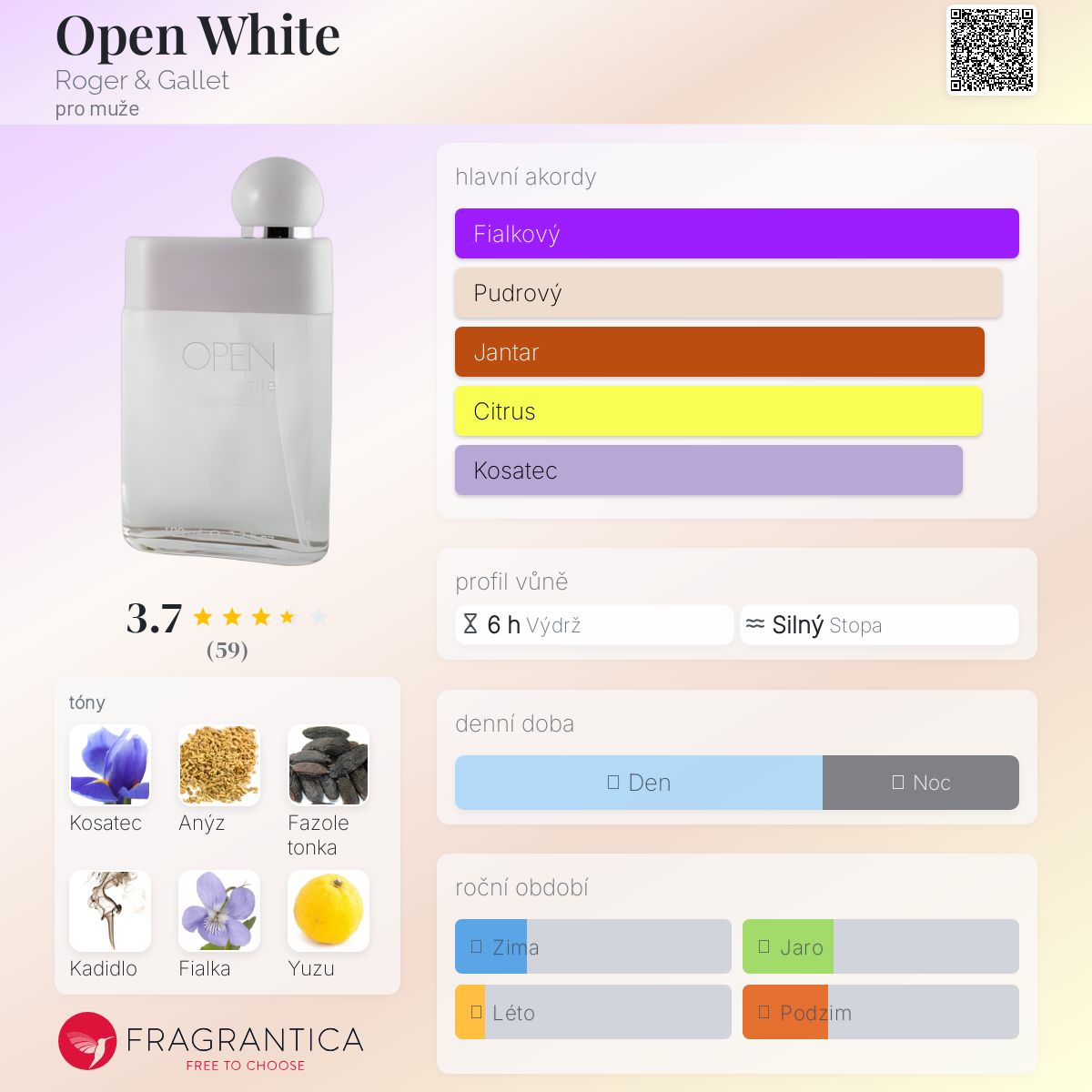Open White podle Roger & Gallet je Floral vůně pro muže. Open White byl/a uveden/a v roce 2013. Vrchní tóny jsou Anýz, Yuzu a Bergamot; střední tóny jsouKadidlo a Fialka ; základní tóny jsou Kosatec, Fazole tonka a Pačuli.