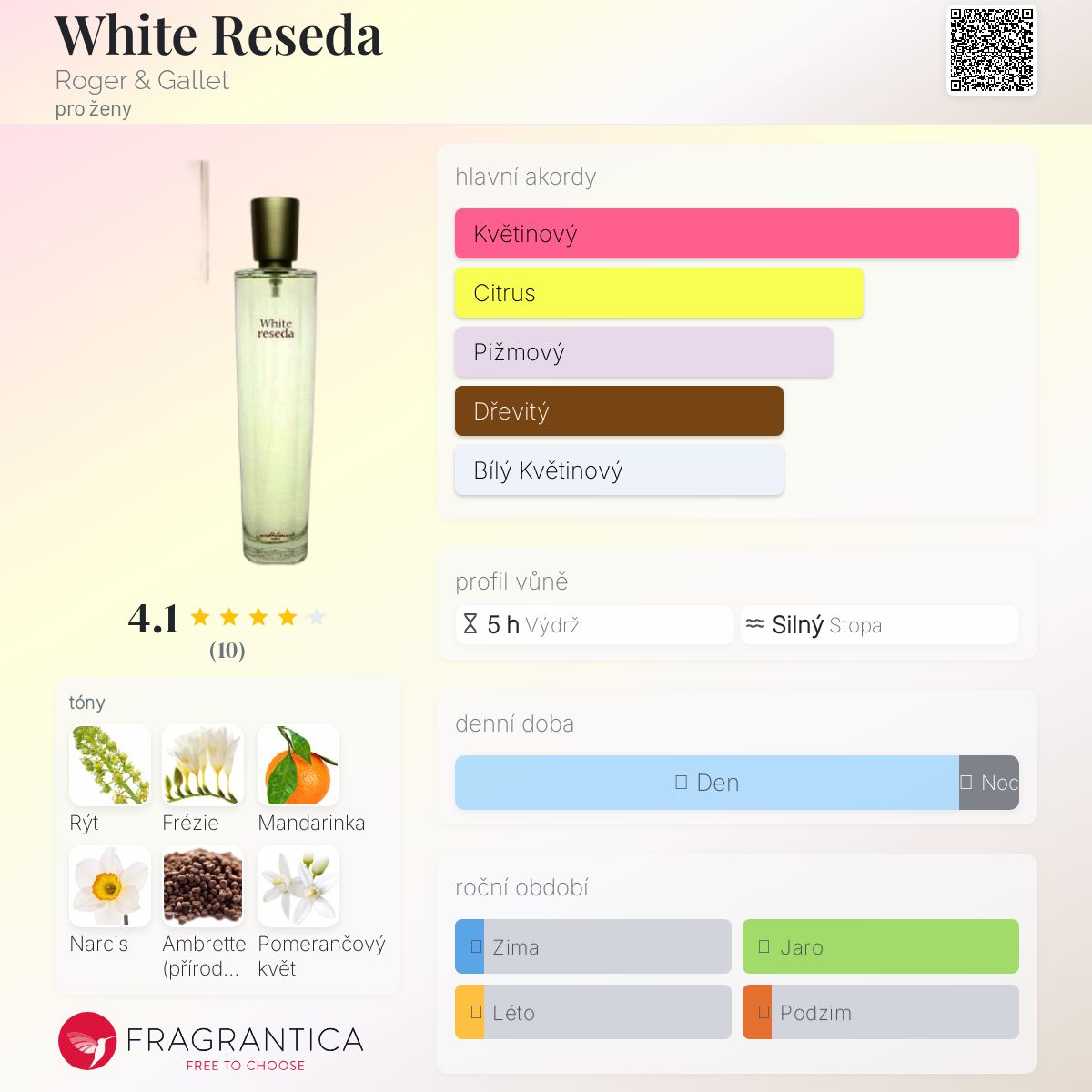 White Reseda podle Roger & Gallet je Floral Woody Musk vůně pro ženy. White Reseda byl/a uveden/a v roce 2002. Vrchní tóny jsou Rýt, Žlutá frézie a Sicilská mandarinka; střední tóny jsouNarcis a Pomerančový květ ; základní tóny jsou Ambrette (přírodní pižmo), Vzácné dřevo a Pižmo.