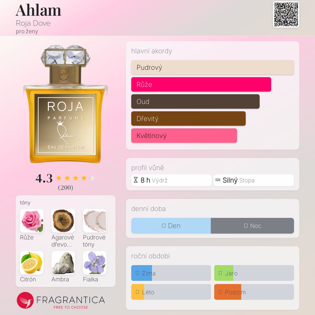 Ahlam podle Roja Dove je Orientální vůně pro ženy. Ahlam byl/a uveden/a v roce 2018. "Nosem" za touto vůní je Roja Dove. Vrchní tón je Citrón ; střední tóny jsouRůže de Mai, Fialka, Ylang-Ylang, Jasmín a Pelargónie ; základní tóny jsou Agarové dřevo (oud), Pudrové tóny, Ambra, Mandle, Santalové dřevo, Vanilka, Rebarbora, Pižmo, Orris, Pačuli a Šafrán.