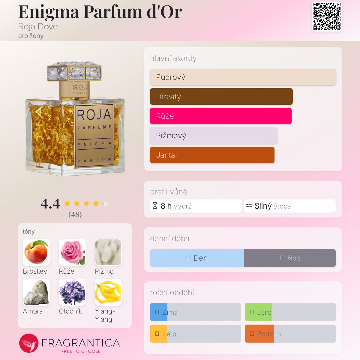 Enigma Parfum d'Or podle Roja Dove je Orientální Floral vůně pro ženy. "Nosem" za touto vůní je Roja Dove. Vrchní tón je Bergamot ; střední tóny jsouBroskev, Růže, Otočník, Ylang-Ylang, Jasmín, Pelargónie a Neroli ; základní tóny jsou Pižmo, Ambra, Kořen orris, Santalové dřevo, Pačuli a Vanilka.