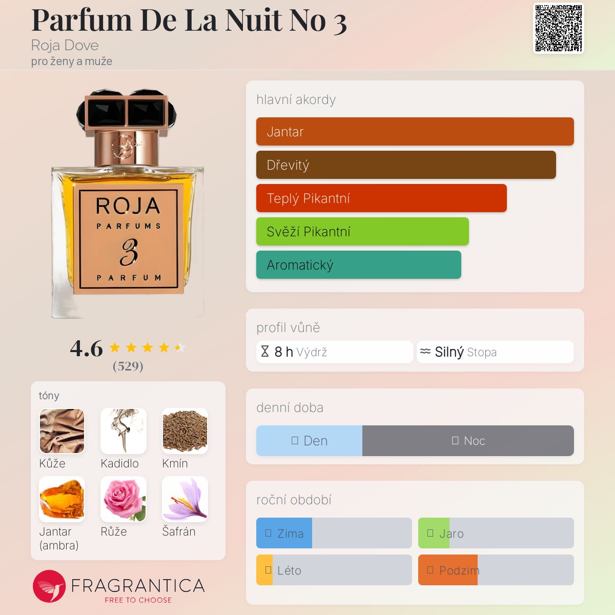 Parfum De La Nuit No 3 podle Roja Dove je Orientální Floral vůně pro ženy a muže. Parfum De La Nuit No 3 byl/a uveden/a v roce 2015. "Nosem" za touto vůní je Roja Dove. Vrchní tón je Bergamot ; střední tóny jsouRůže a Pelyněk ; základní tóny jsou Kůže, Kadidlo, Kmín, Jantar (ambra), Šafrán, Benzoin, Styrax, Kardamom, Labdanum, Gurjanský balzám, Santalové dřevo, Cedr, Amyris, Pačuli, Jalovec, Guajakové dřevo a Cypriolový olej.