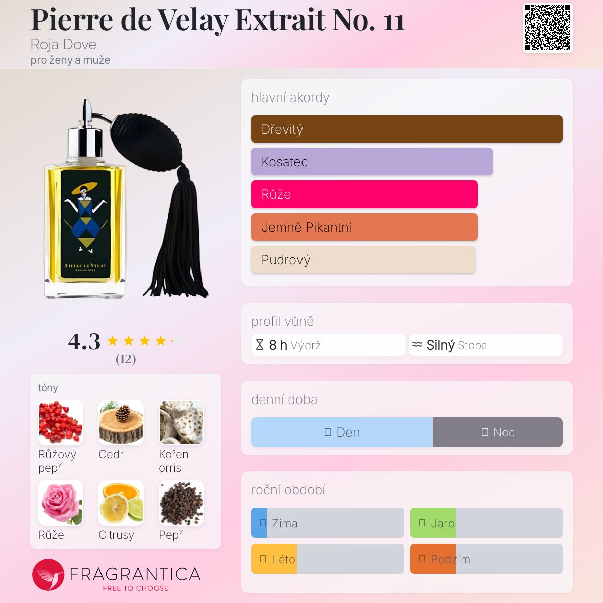 Pierre de Velay Extrait No. 11 podle Roja Dove je Chypre vůně pro ženy a muže. Pierre de Velay Extrait No. 11 byl/a uveden/a v roce 2013. "Nosem" za touto vůní je Roja Dove. Vrchní tóny jsou Růžový pepř, Citrusy a Pepř; střední tóny jsouRůže a Jasmín ; základní tóny jsou Cedr, Kořen orris, Pačuli a Dubový mech.