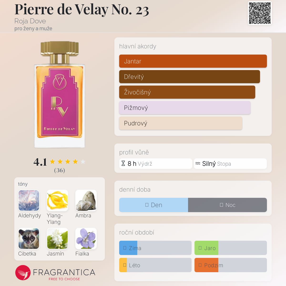 Pierre de Velay No. 23 podle Roja Dove je Floral vůně pro ženy a muže. Pierre de Velay No. 23 byl/a uveden/a v roce 2019. "Nosem" za touto vůní je Roja Dove. Vrchní tóny jsou Aldehydy, Bergamot a Mandarinka; střední tóny jsouYlang-Ylang, Jasmín, Fialka, Růže de Mai a Pomerančový květ ; základní tóny jsou Ambra, Cibetka, Labdanum, Kůže, Pižmo, Cedr, Dubový mech, Tabák, Santalové dřevo, Hřebíček, Vetiver, Benzoin, Fazole tonka a Vanilka.