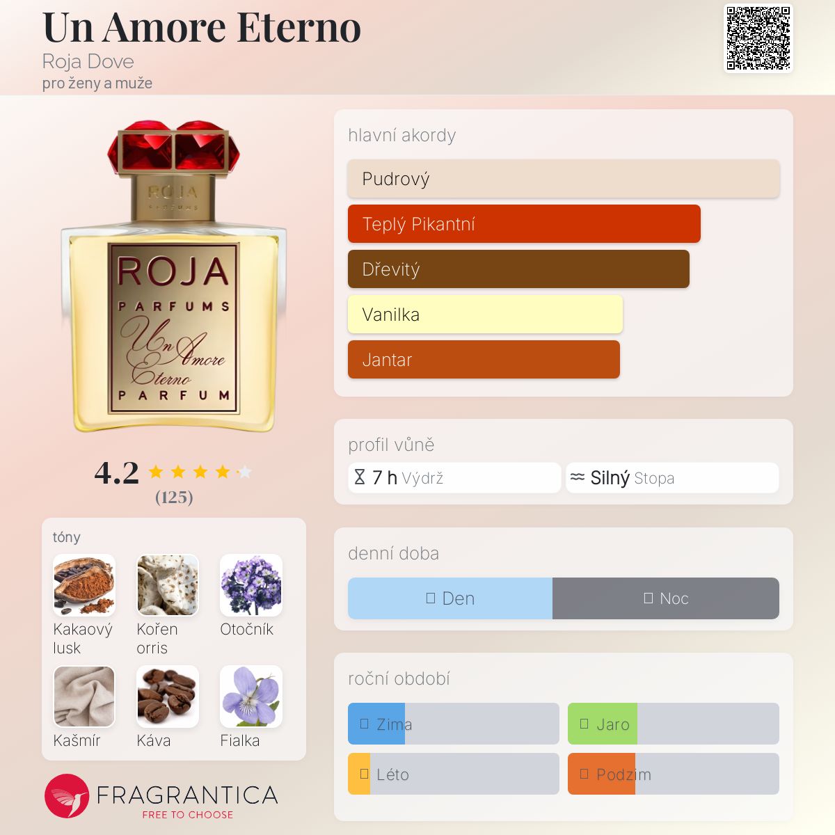 Un Amore Eterno podle Roja Dove je Aromatic Spicy vůně pro ženy a muže. Un Amore Eterno byl/a uveden/a v roce 2016. "Nosem" za touto vůní je Roja Dove. Vrchní tón je Citrón ; střední tóny jsouOtočník, Fialka, Tuberóza, Růže a Jasmín ; základní tóny jsou Kakao, Kořen orris, Kašmír, Káva, Ambra, Cedr, Zázvor, Vanilka, Pačuli, Pižmo, Šafrán a Hřebíček.