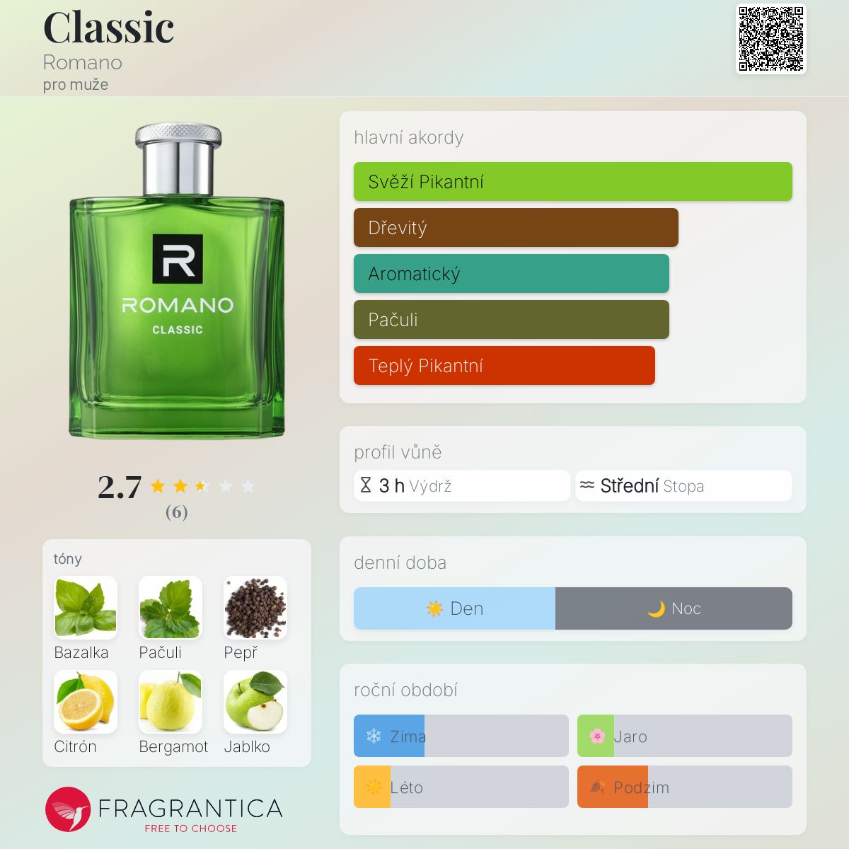 Classic podle Romano je Aromatic Fougere vůně pro muže. Classic byl/a uveden/a v roce 2019. Vrchní tóny jsou Bazalka, Citrón a Bergamot; střední tóny jsouČerný pepř a Zelené jablko ; základní tóny jsou Pačuli, Santalové dřevo a Mech.