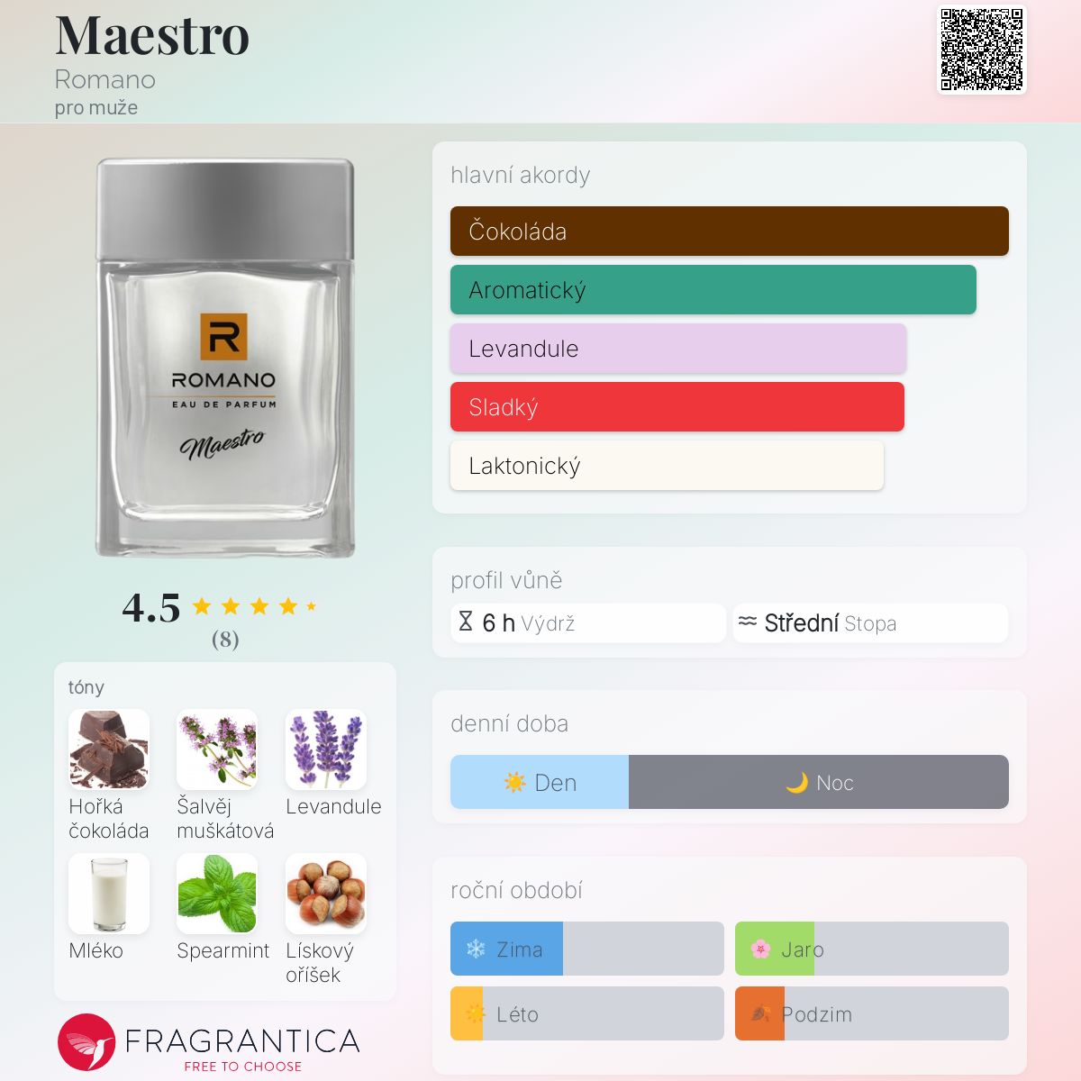 Maestro podle Romano je Orientální vůně pro muže. Toto je nová vůně. Maestro byl/a uveden/a v roce 2024. Vrchní tóny jsou Šalvěj muškátová, Máta kadeřavá a Bergamot; střední tóny jsouLevandule, Mléko a Lískový oříšek ; základní tóny jsou Hořká čokoláda a Mech.