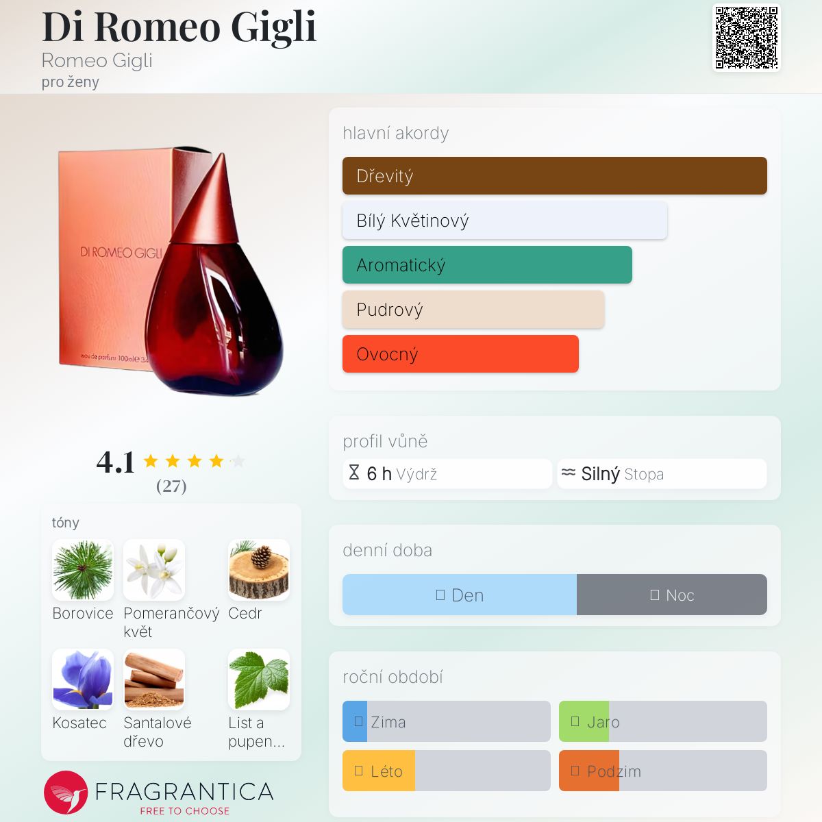 Di Romeo Gigli podle Romeo Gigli je Floral vůně pro ženy. Di Romeo Gigli byl/a uveden/a v roce 1999. "Nosem" za touto vůní je Nathalie Feisthauer. Vrchní tóny jsou Květ afrického pomeranče, Černý rybíz a Plumérie; střední tóny jsouKosatec, Zimolez a Jasmín ; základní tóny jsou Borovice, Virginský cedr, Santalové dřevo a Jantar (ambra).