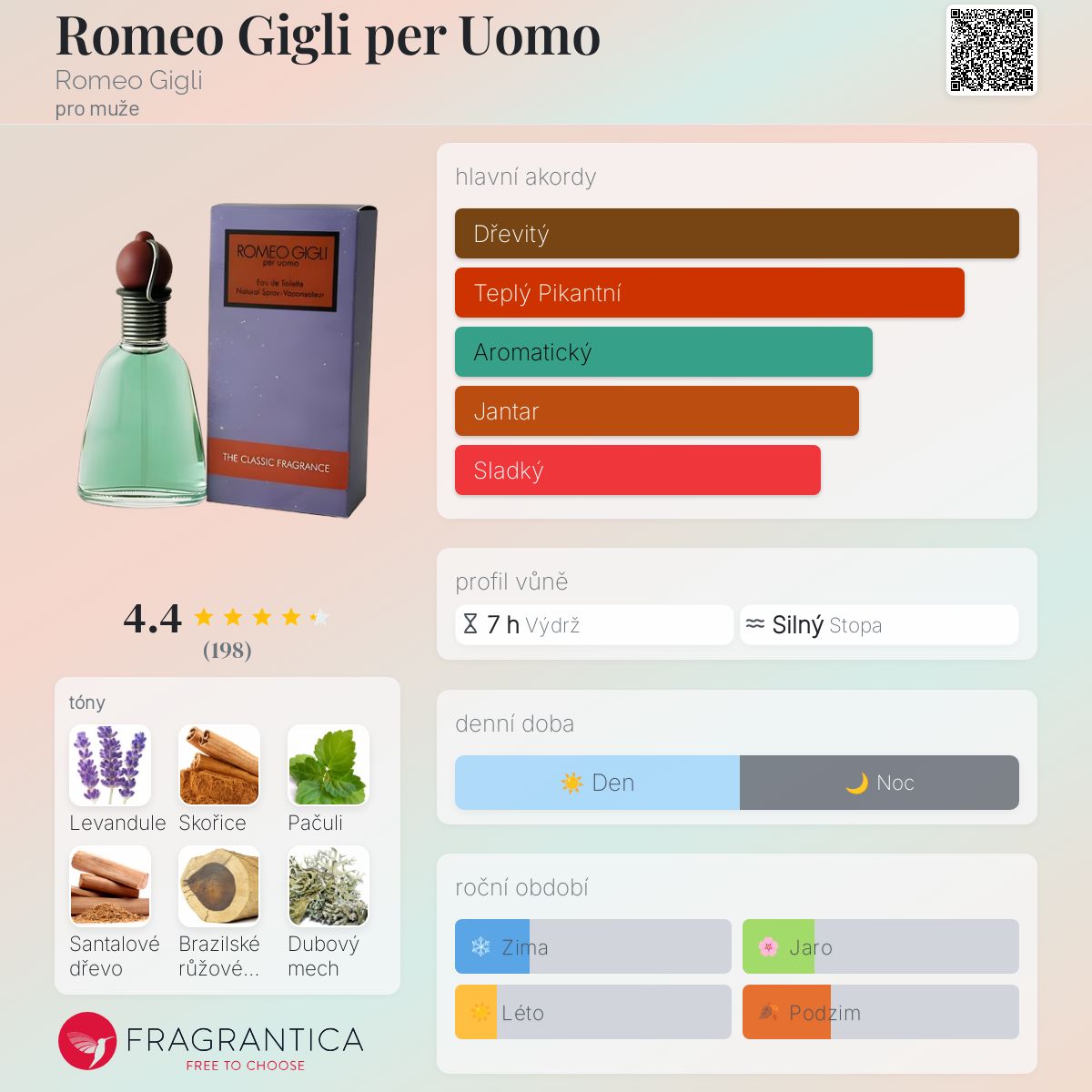 Romeo Gigli per Uomo podle Romeo Gigli je Orientální Spicy vůně pro muže. Romeo Gigli per Uomo byl/a uveden/a v roce 1991. "Nosem" za touto vůní je Alberto Morillas. Vrchní tóny jsou Levandule, Brazilské růžové dřevo, Švestka, Estragon, Aldehydy, Bergamot, Mandarinka, Grapefruit a Citrónovník; střední tóny jsouSkořice, Jedle balzámová, Karafiát, Med, Zázvor, Růže a Jasmín ; základní tóny jsou Pačuli, Santalové dřevo, Dubový mech, Benzoin, Vanilka, Cedr, Pižmo, Jantar (ambra), Fazole tonka a Styrax.