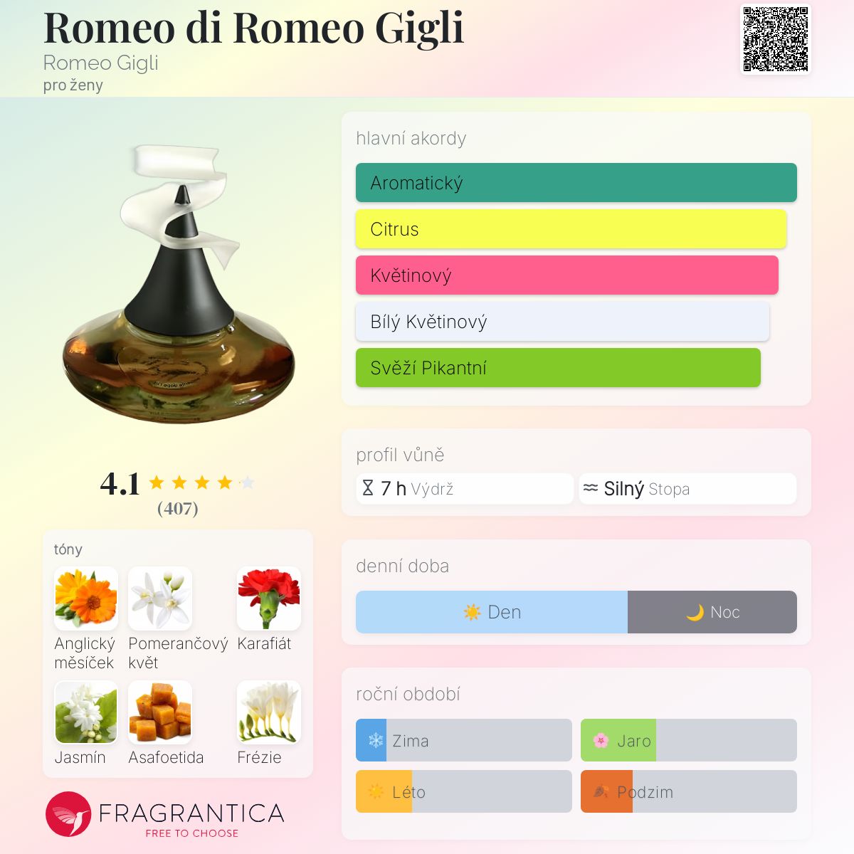 Romeo di Romeo Gigli podle Romeo Gigli je Floral vůně pro ženy. Romeo di Romeo Gigli byl/a uveden/a v roce 1989. "Nosem" za touto vůní je Sophie Labbe. Vrchní tóny jsou Měsíček, Asafoetida, Bazalka, Limetka, Citrusy, Bergamot, Mango a Mandarinka; střední tóny jsouPomerančový květ, Karafiát, Jasmín, Frézie, Kasie, Konvalinka, Kosatec a Růže ; základní tóny jsou Kořen orris, Benzoin, Santalové dřevo a Kadidlo.