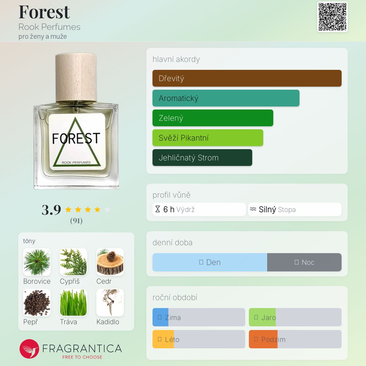 Forest podle Rook Perfumes je vůně pro ženy a muže. Forest byl/a uveden/a v roce 2018. "Nosem" za touto vůní je Nadeem Crowe. Vrchní tóny jsou Borovice, Cypřiš, Černý pepř a Tráva; střední tóny jsouKadidlo, Konopí a Pačuli ; základní tóny jsou Cedr a Bílé pižmo.